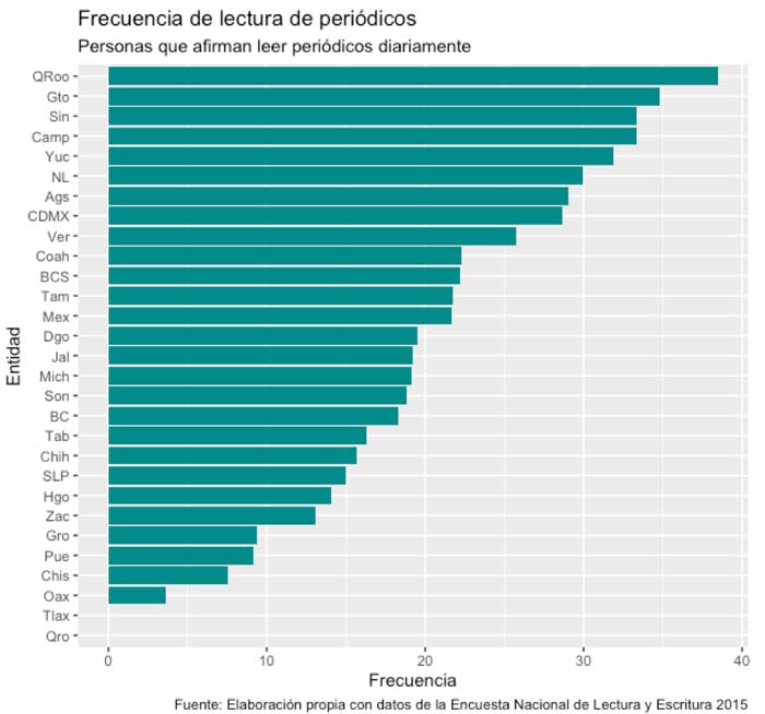 De acuerdo con la ENLE, los estados donde más población afirma leer diarios son Sinaloa, Tamaulipas y Yucatán, con 74%. En el otro extremo se ubica Oaxaca, donde sólo el 31% dijo leer diarios (gráfica 1).