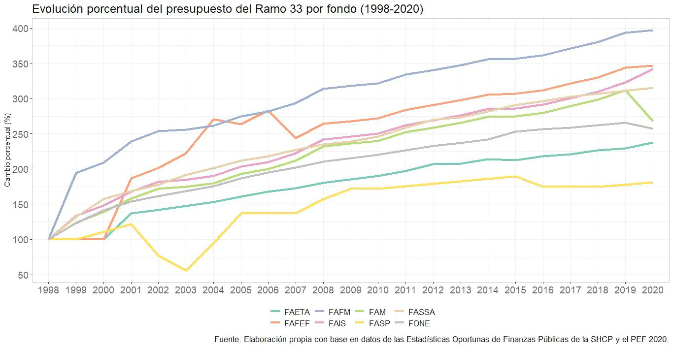 1) Hay una tendencia a la alza, estable y predecible, en la evolución del presupuesto de los ocho fondos que conforman el Ramo 33.
