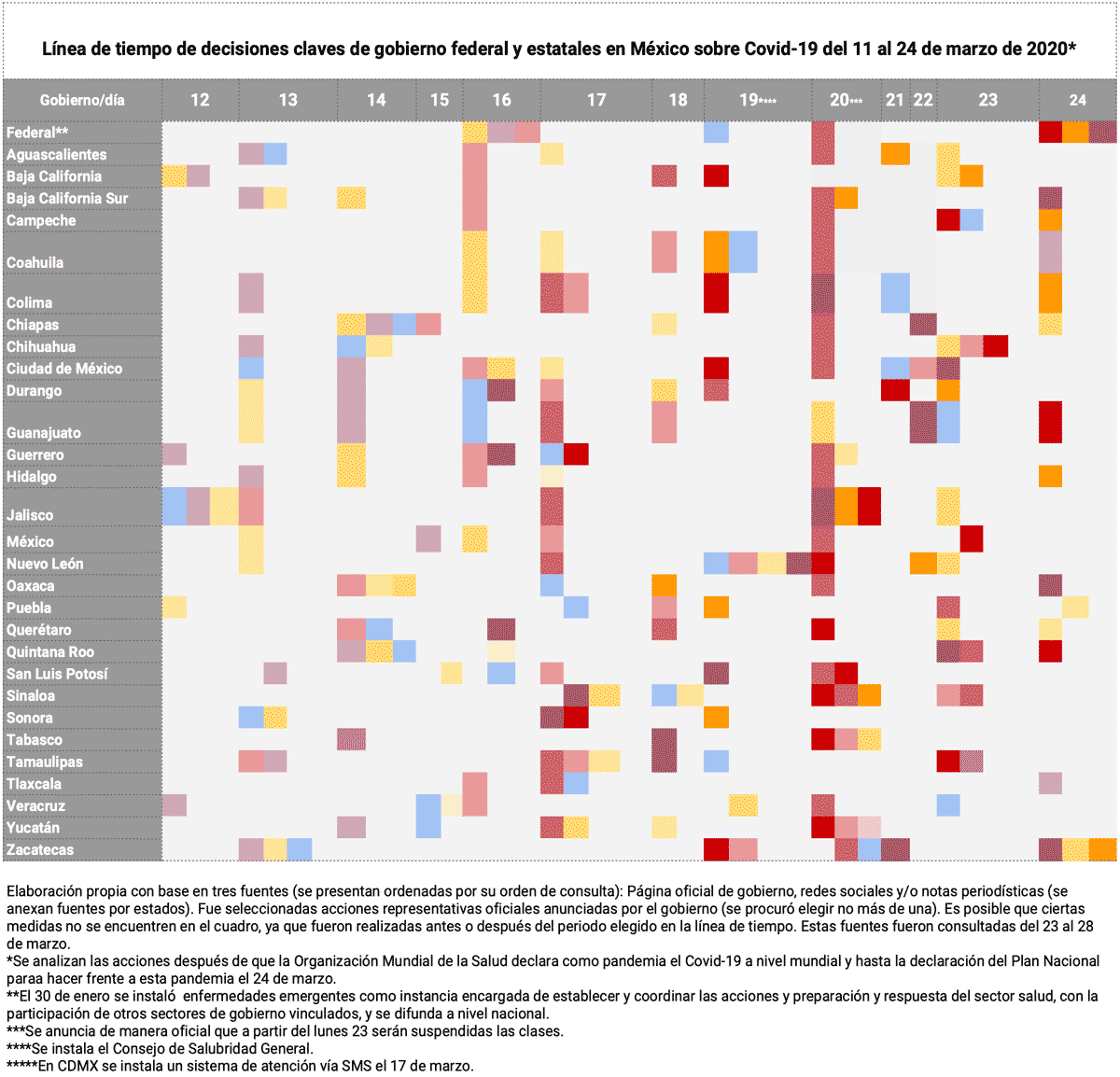 Para ilustrar nuestro punto clasificamos las decisiones más representativas del gobierno federal y los estatales ante esta emergencia y, posteriormente, las ordenamos, por día, en una línea del tiempo (LT).2 Así ejemplificamos la existencia de acciones aisladas (o como ha sido llamado, un mosaico de colores federalista), y resaltamos la importancia de contar con estrategias coordinadas que se articulen a partir de espacios y herramientas definidas.
