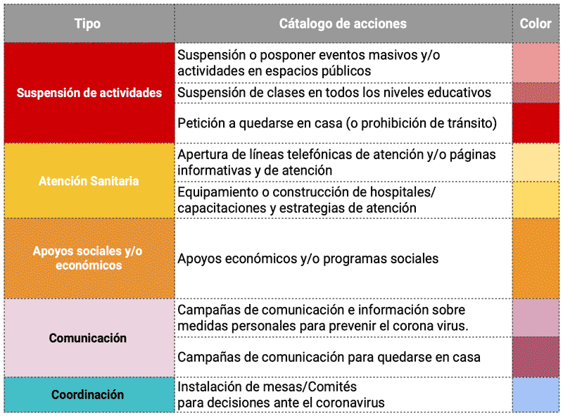 No obstante, hasta hoy, el gobierno federal y los locales han tomado decisiones distintas, distantes y en diferentes tiempos. Por ejemplo, la suspensión de clases o de eventos masivos ha ocurrido en diferentes momentos (LT color rojo). Incluso, en algunas entidades, se instauraron medidas como la cárcel ante incumplimiento de aislamiento (Chihuahua), o toques de queda “para combatir los efectos del Covid-19” (hasta el 24 de marzo, 16 municipios en Sonora).