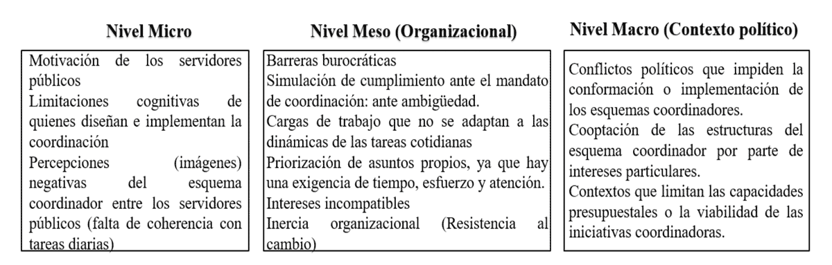 El esquema 1 sintetiza diversos fenómenos que la literatura refiere como obstáculos a la coordinación. Algunos de estos han sido identificados en el caso de los SEA.