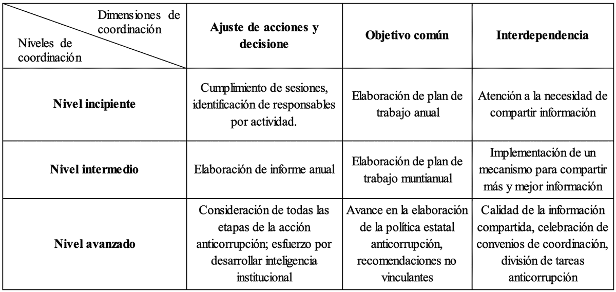 La tabla 1 resume los niveles de coordinación y las dimensiones que guían la medición: