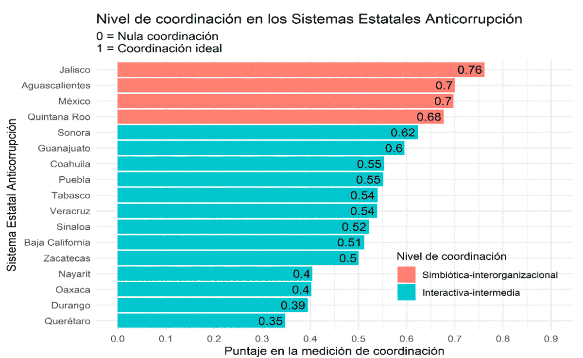 La matriz permite otorgar una puntuación de 0 a 1 a los Sistemas Estatales Anticorrupción, donde 1 es la puntuación máxima que indica un escenario de coordinación ideal, es decir, un estado de coordinación que permite a las organizaciones actuar como un todo organizacional que es más que la suma de las partes. La gráfica 1 muestra el puntaje que obtuvieron 17 SEA analizados hasta la fecha de acuerdo con la información a la que se pudo tener acceso, así como la ubicación que ocupan en el continuo de coordinación de 0 a 1.