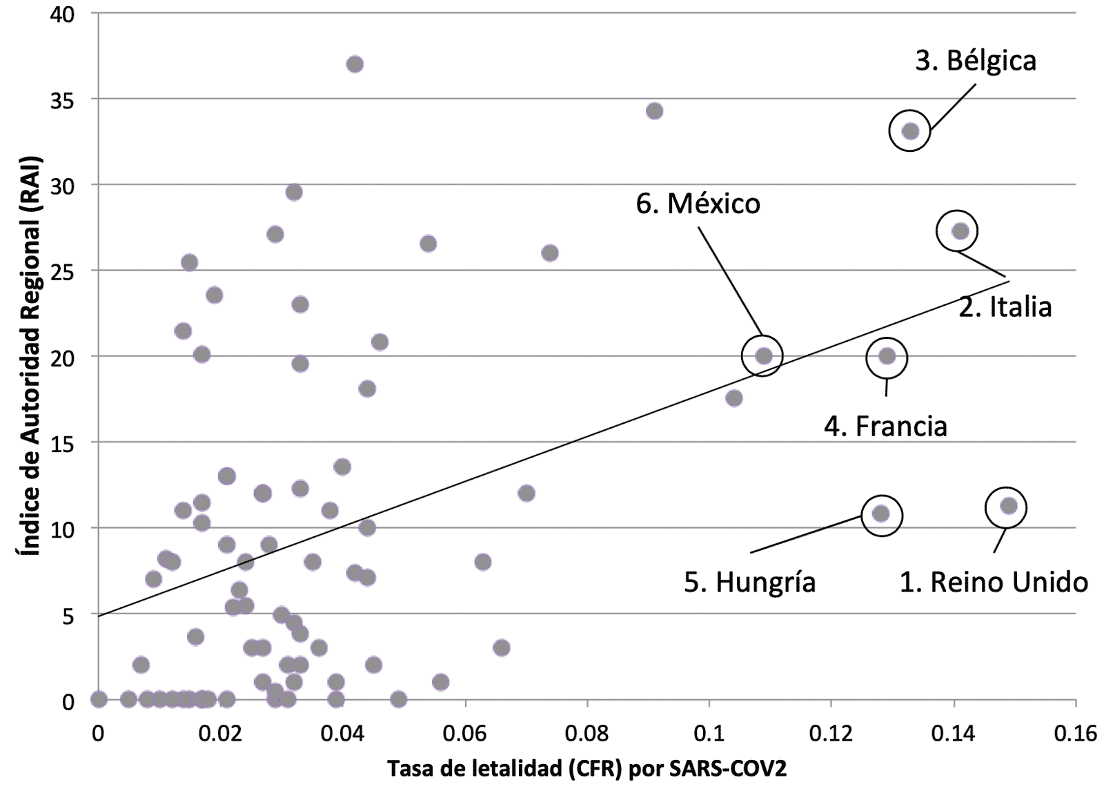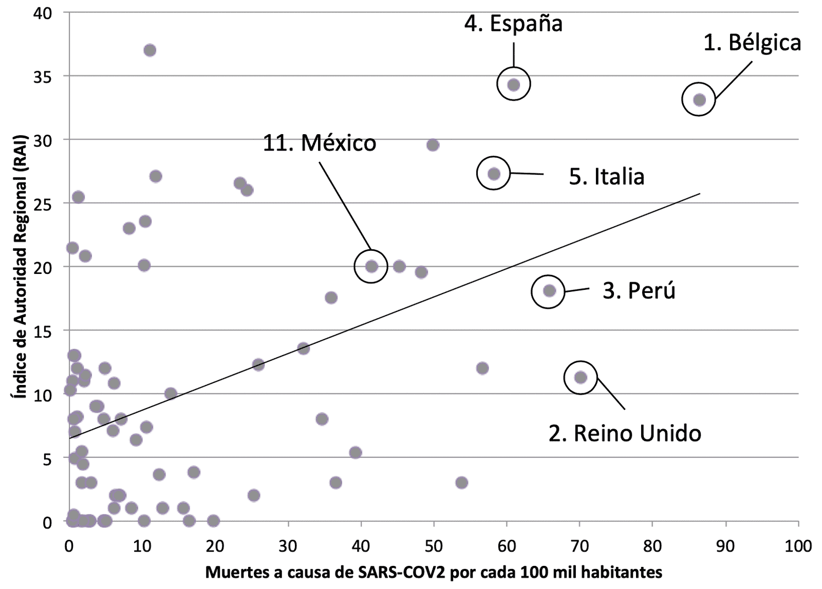 La figura 1 muestra la relación entre las muertes a causa de covid-19 por cada 100 000 habitantes y su relación con el índice. La recta negra muestra la relación lineal creciente entre ambas variables. Se muestran también los cinco países con mayor número de muertes por cada 100 000 habitantes; el número a la izquierda del nombre del país representa el orden dentro de los 78 incluidos en la muestra. El país con mayor número de muertes es Bélgica, a la vez uno de los países con mayor autonomía regional. Reino Unido, en contraste, tiene el segundo lugar en defunciones, pero se encuentra cercano a la mitad del índice. Alemania cuenta con el índice más alto, sin embargo, sólo tiene 11 muertes por cada 100 000 habitantes —13 % de las muertes de Bélgica. México ocupa el lugar 11 en muertes y la posición 15 en el RAI.