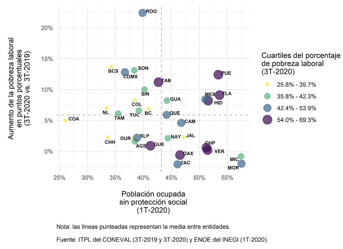 Aunque cada entidad es una historia diferente en términos de protección social y afectación económica laboral por la pandemia, es posible dividirlas en cuatro grupos. El primer cuadrante, el superior derecho, está conformado por las entidades con una proporción de la población ocupada sin protección social por encima de la media, así como por ser de las entidades que tuvieron los mayores aumentos en pobreza laboral (de forma clara: el Estado de México, Hidalgo, Puebla y Tlaxcala). Estas entidades tenían una gran parte de la población en situación de vulnerabilidad y, lamentablemente, han tenido un aumento más grande de la pobreza laboral. Estas entidades requieren fuertemente de algún esquema que compense ingresos de la población, máxime por ser algunos de ellos estados en los que vive una gran parte de la población del país y por tener de las mayores proporciones de población en pobreza laboral.