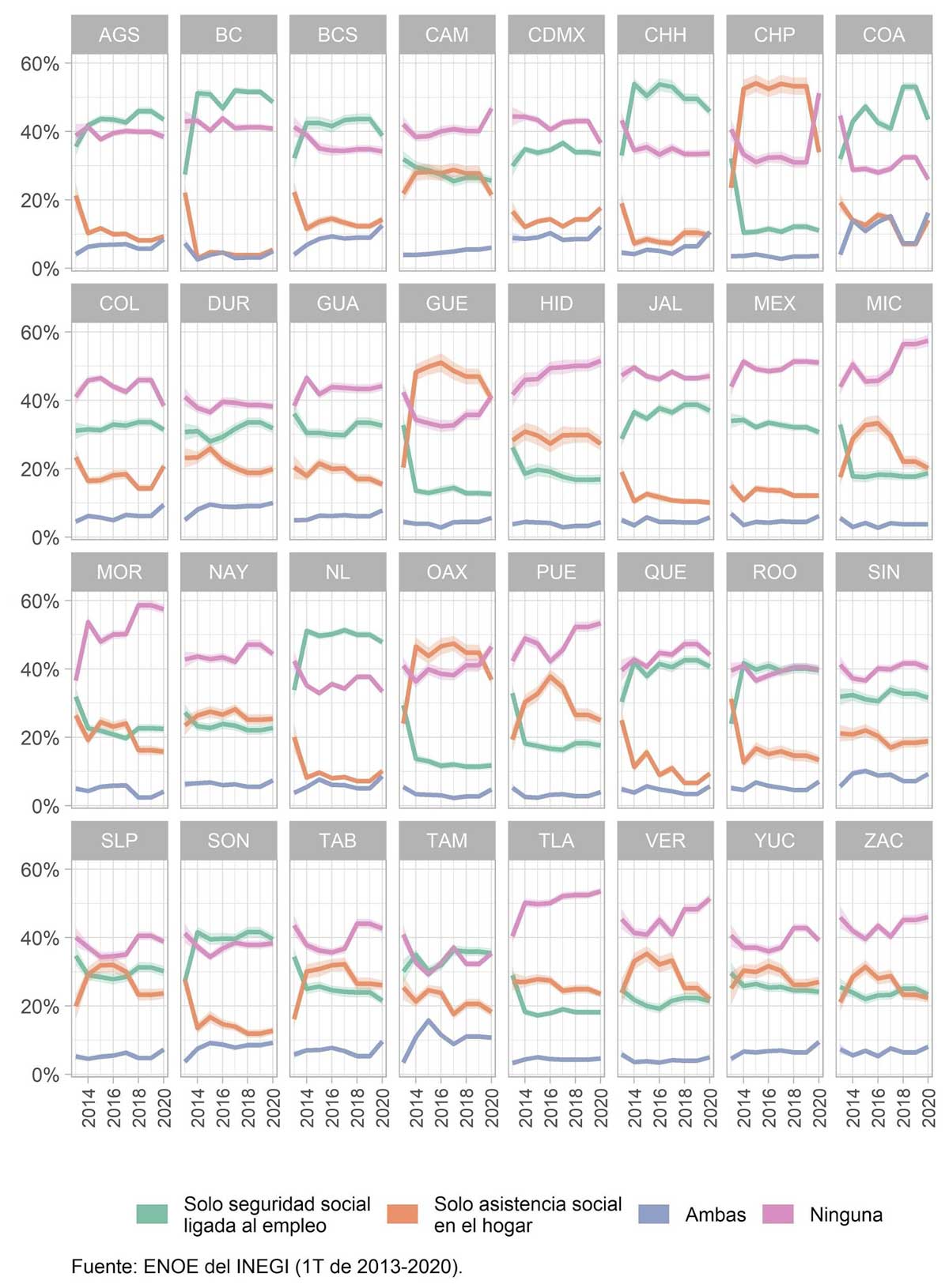 Los mecanismos de protección social en el país —en su combinación de seguridad social contributiva asociada al empleo y de programas de asistencia social (como la pensión para personas adultas mayores)— no tienden a variar tanto entre entidades, pero sí lo hacen sus coberturas (tanto sobre la población en general como sobre la población con mayores carencias sociales). En esta entrada analizo la trayectoria de la cobertura de protección social que tenía la población ocupada antes de la pandemia en las entidades y, posteriormente, comparo esta información con los aumentos de la pobreza laboral en el tercer trimestre de 2020. Este contraste permite argumentar que es necesario continuar atendiendo los rezagos estructurales en entidades del país con alta prevalencia de pobreza (como Chiapas, Guerrero y Oaxaca), pero también las nuevas afectaciones que han surgido tras la pandemia: en especial, a las personas que quizá antes no vivían en pobreza, pero que estaban en vulnerabilidad ante una afectación económica como la que vive el país y que no cuentan con esquemas de protección social (como parece estar pasando en el Estado de México, Hidalgo, Puebla y Tlaxcala).