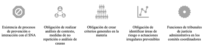 Del análisis de la regulación de la prevención se desprende que el único procedimiento en el que podrían participar los tribunales de justicia administrativa es el previsto en el artículo 15, pues el resto se refiere a políticas y códigos de ética. Sin embargo, dos grandes conclusiones se desprenden de este procedimiento. La primera es que los procedimientos de prevención son optativos. La ley general no prevé la obligatoriedad de adoptar procedimientos de prevención a los actores del sistema. La segunda es que no existe claridad en cuanto a la forma y los elementos que deben tomarse en cuenta para realizar los diagnósticos a que se refieren estos procesos de prevención.