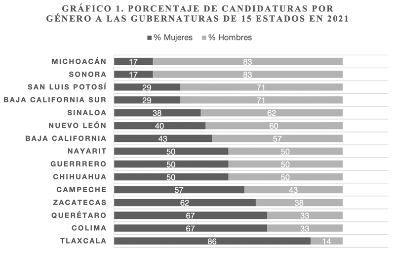 Sin embargo, la distribución de candidaturas no es homogénea en cuanto al porcentaje por género en cada entidad respecto a las cifras expuestas al final del párrafo precedente. Se observan estados en los que el porcentaje de mujeres alcanza el 86 % (Tlaxcala) de las personas contendientes y, en el extremo opuesto apenas el 17 % (Michoacán y Sonora); en cinco entidades el porcentaje de mujeres candidatas es mayor al de los hombres, en tres estados es igual, y en siete entidades es porcentaje de hombres es mayor, como se aprecia en la siguiente gráfica.