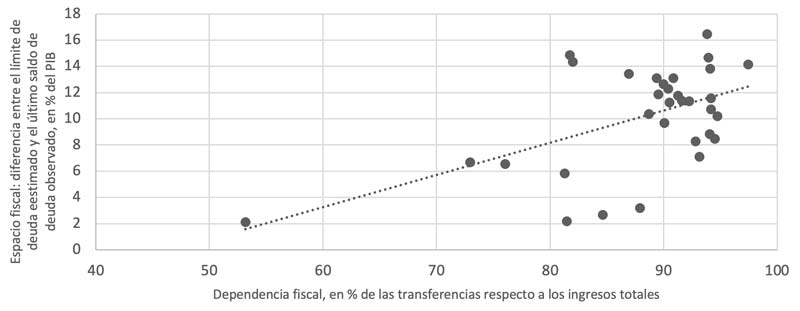 La dependencia fiscal de los gobiernos estatales mexicanos tiene una relación positiva con los límites de deuda estimados en nuestro estudio: los estados más dependientes a las transferencias son aquellos que tienen mayor espacio para acceder a deuda pública. Esta relación, sin duda, merece especial atención en términos de la construcción de indicadores de medición para la toma de decisiones de política —como se propuso recientemente—,9 y en el ámbito de la investigación sobre el federalismo fiscal mexicano frente a la necesidad de profundizar en la relación y los incentivos existentes entre la dependencia fiscal y el acceso a créditos.