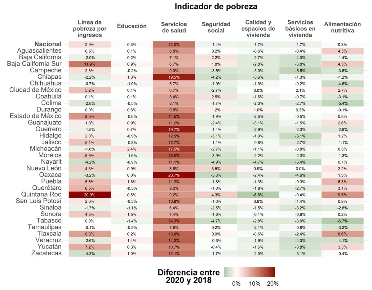 Ahora bien, el siguiente análisis considera únicamente la diferencia en el porcentaje de la población por debajo de la línea de pobreza por ingresos (para garantizar necesidades tanto alimentarias como no alimentarias de una persona al mes), o con la carencia de algún derecho entre 2018 y 2020. Lo anterior implica que una diferencia con signo positivo sería socialmente negativa: un mayor porcentaje de la población experimenta algo indeseable. Por el contrario, una cifra con número negativo sería socialmente positiva: hay un menor porcentaje de personas con ingresos insuficientes o con carencias. Asimismo, es importante mencionar que mantener el mismo porcentaje —o incluso algunas disminuciones— podría significar que hay más personas en esa situación, aunque represente el mismo —o menor— porcentaje con respecto al total.
