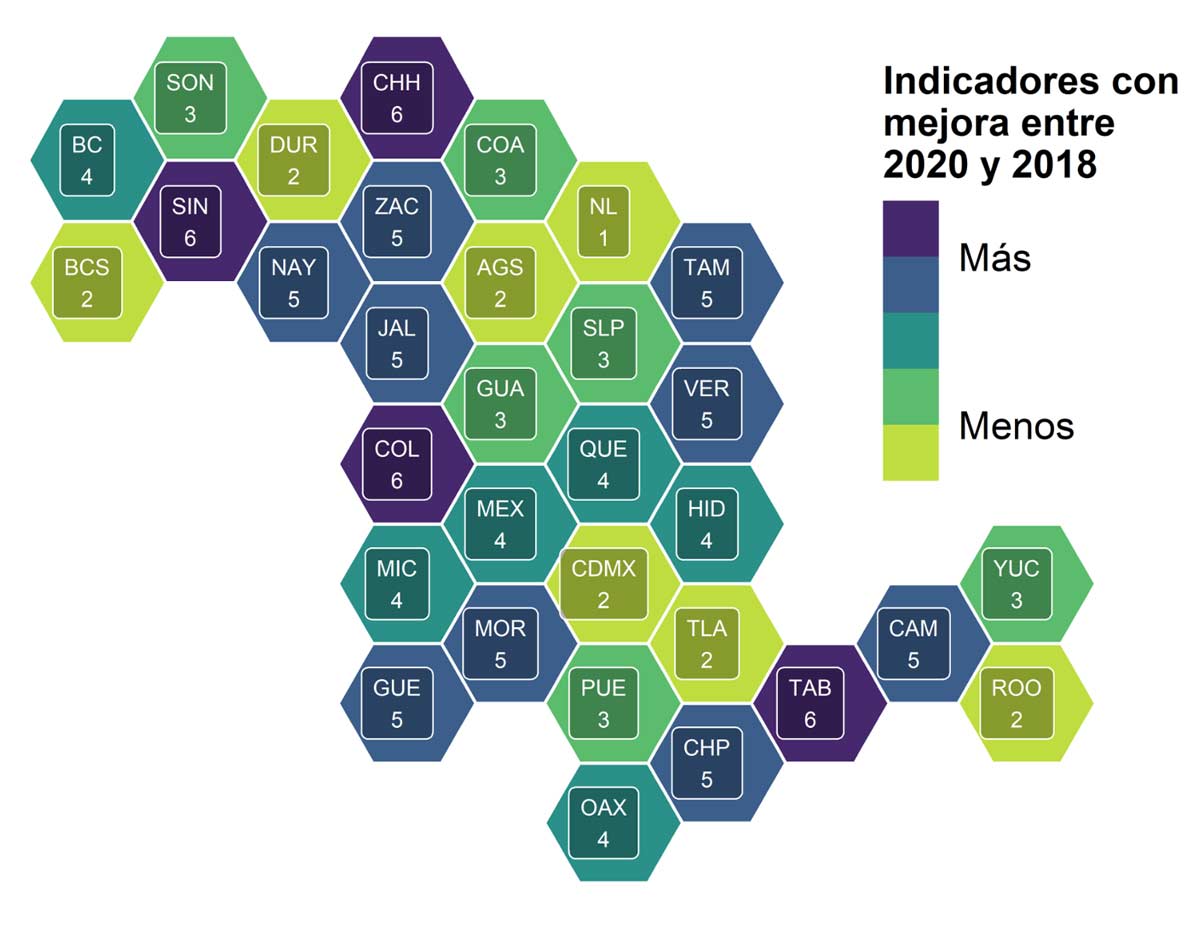 De los siete indicadores principales de la pobreza multidimensional, Chihuahua, Colima, Sinaloa y Tabasco mejoraron en seis; el caso opuesto es el de Nuevo León, que sólo mejoró en uno (ver figura 3). El promedio de indicadores con mejora entre entidades es de 3.8, la mediana es de 4, y hubo avances en 124 indicadores-entidad de los 224 posibles (es decir, en el 55.3 %). Lo anterior parecería indicar que en las entidades hubo ligeramente más avances que retrocesos. Sin embargo, al observar la magnitud de estos cambios, la situación se inclina hacia un mayor retroceso.