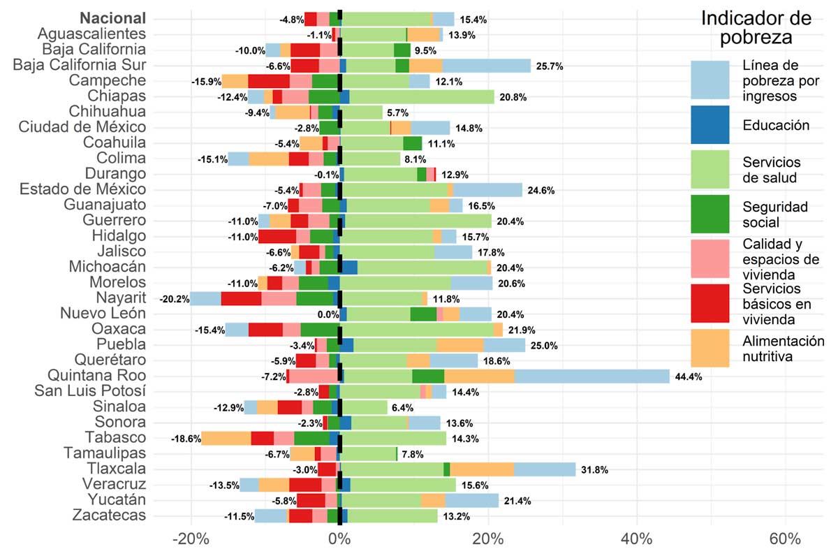 Estos avances y retrocesos son producto de varios factores: coyunturales —como la pandemia—, inerciales —de las estructuras socioeconómicas del país— y de decisiones puntuales de política pública de los tres niveles de gobierno. El principal atributo de la medición del Coneval es mostrar una fotografía de los aspectos más sustanciales del país para diagnosticar áreas que requieren atención: en algunos lugares como Quintana Roo, Tlaxcala, Puebla o el Estado de México, así como en el tema de acceso a la salud. Asimismo, esta medición permite observar lugares con grandes avances con la posibilidad de profundizar en aspectos podrían ser replicados en otros lugares: como los de Nayarit con reducciones de puntos porcentuales de gran magnitud o de Chihuahua, Colima, Sinaloa y Tabasco con mejoras en casi todos los indicadores.