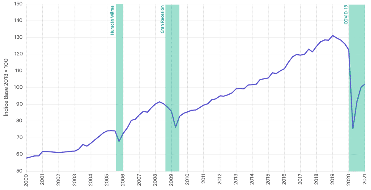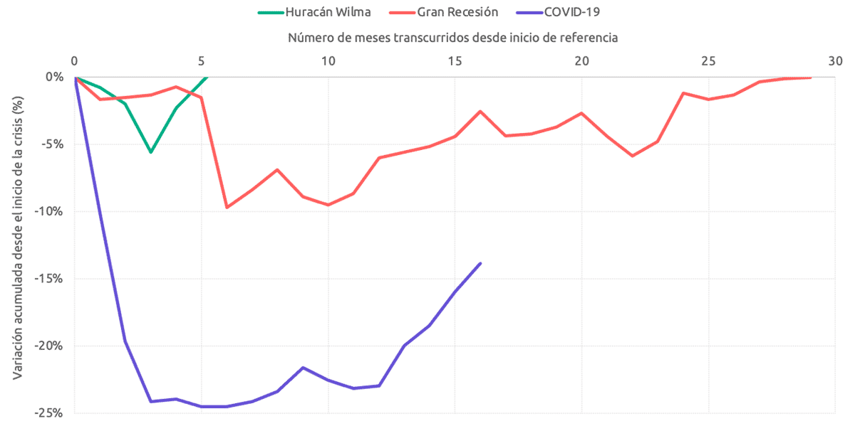 Como puede observarse, la recuperación del empleo en el caso del impacto del huracán Wilma y de la Gran Recesión fue de cinco y casi treinta meses desde la ocurrencia de cada evento, respectivamente; con una caída acumulada de no más del 10 %. En el caso de la crisis económica derivada de las medidas por la pandemia de covid-19, la caída acumulada alcanzó casi el 25 % en la pérdida de puestos de empleo en apenas cinco meses, con una recuperación más acelerada que en la Gran Recesión pero aún muy por debajo de los niveles de empleo de finales de 2020.