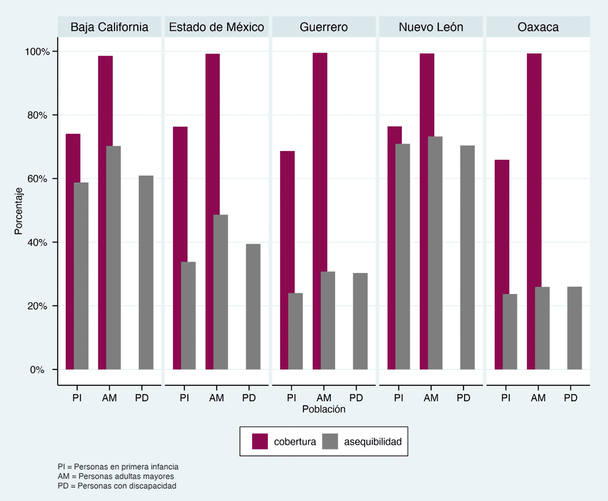 Fuente: elaboración propia con base en Michel et al. (2020) y con datos de la Encuesta Nacional de Empleo y Seguridad Social (ENESS) 2017, el Censo de Alojamientos de Asistencia Social (CAAS) 2015, el Censo 2020 y la Encuesta Nacional de Ingresos y Gastos de los Hogares (ENIGH) 2018. El indicador de cobertura se refiere al porcentaje de personas en cada grupo poblacional cuyos cuidados personales son proporcionados por un familiar adulto en el hogar (con la información disponible no es posible calcular este indicador para las personas con discapacidad). La asequibilidad es el porcentaje de personas en cada grupo poblacional que viven en un hogar con un ingreso per cápita igual o superior a la línea de bienestar.