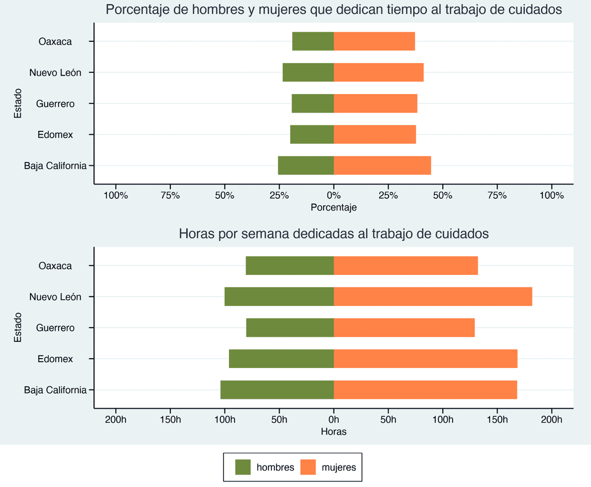Ahora bien, ya sea de manera remunerada como no remunerada, las labores de cuidados en las entidades están altamente feminizadas. En cuanto a la provisión de los no remunerados, en Baja California y Nuevo León se observa un ligero incremento en la participación masculina al compararlos con las otras entidades. No obstante, la realidad es que en todas las entidades aún son más las mujeres quienes dedican tiempo (y mucho más que los hombres) a la realización de estas tareas.