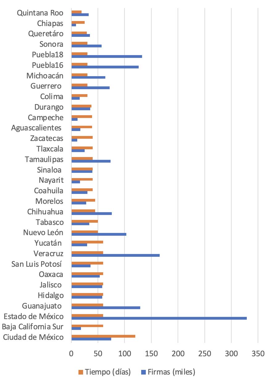 A partir de la media y desviación estándar de las firmas por día se clasificaron los niveles de restricción de las entidades federativas. El valor de la media se ubicó en 1465.97 firmas y la desviación estándar fue de 1311.02. Los estados por debajo de la media con menos de 1465 firmas serán considerados con un nivel de restricción bajo; los ubicados entre la media y hasta una desviación estándar (entre 1465 y 2777) tendrán una restricción media, y aquellos que rebasen la media más una desviación estándar (mayor a 2777 firmas) tendrán niveles altos de restricción.