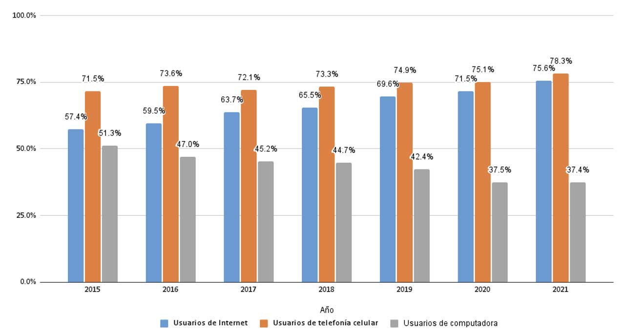 Los datos más recientes de la Encuesta Nacional sobre Disponibilidad y Uso de Tecnologías de la Información en los Hogares (ENDUTIH), realizada por el Instituto Nacional de Estadística y Geografía (INEGI), muestran que a nivel nacional el 75.6 % de los mexicanos tiene acceso a internet (hace apenas cinco años esa cifra sólo alcanzaba el 63.7 %). Prácticamente 8 de cada 10 mexicanos son usuarios de telefonía celular (en 2017 esa cifra era de 72.1 %) y 4 de cada 10 cuenta con una computadora (45.2 % en 2017).
