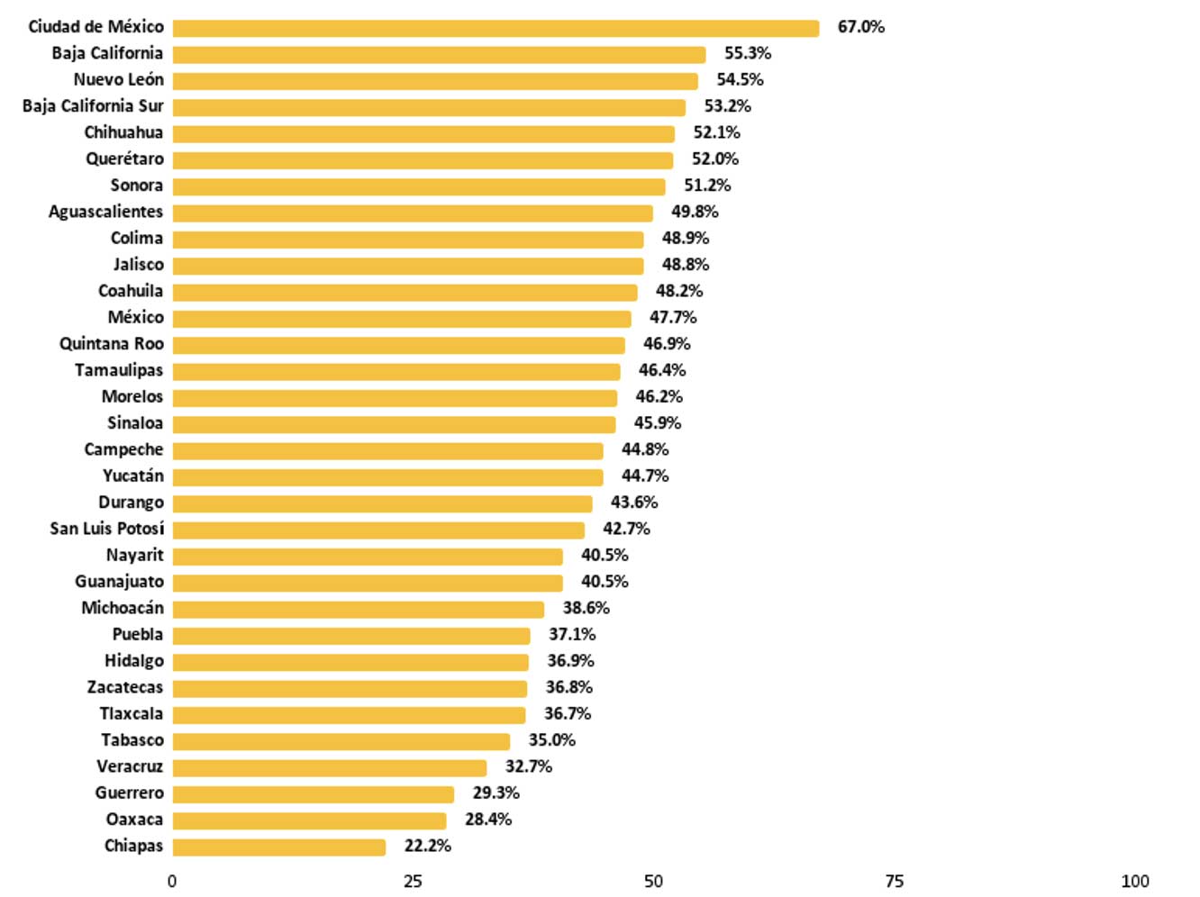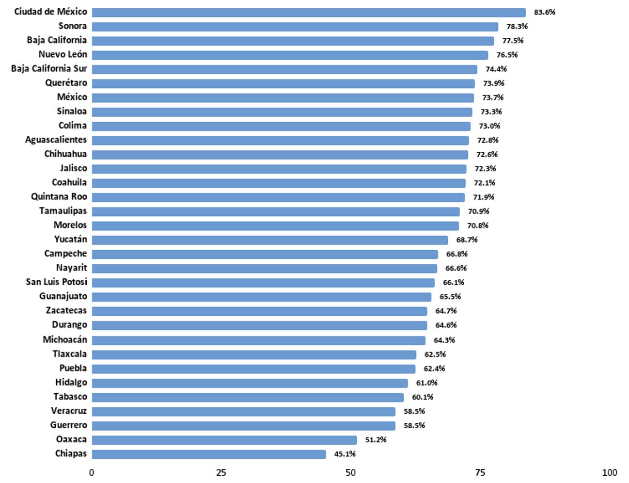 Aunque estos números suponen un avance sólo reflejan un promedio nacional, mismo que no permite observar el estado del ejercicio de este derecho en cada una de las entidades federativas, cuyas dinámicas son distintas dado su propio contexto. La realidad indica que el acceso a las TIC es muy desigual. Al desagregar los datos a nivel estatal se muestra que en entidades como Chiapas y Oaxaca apenas la mitad de los hogares tienen acceso a dichas herramientas. En cambio, dentro de la Ciudad de México, Sonora y Baja California, prácticamente 8 de cada 10 hogares cuentan con acceso a internet, una computadora o un teléfono celular.