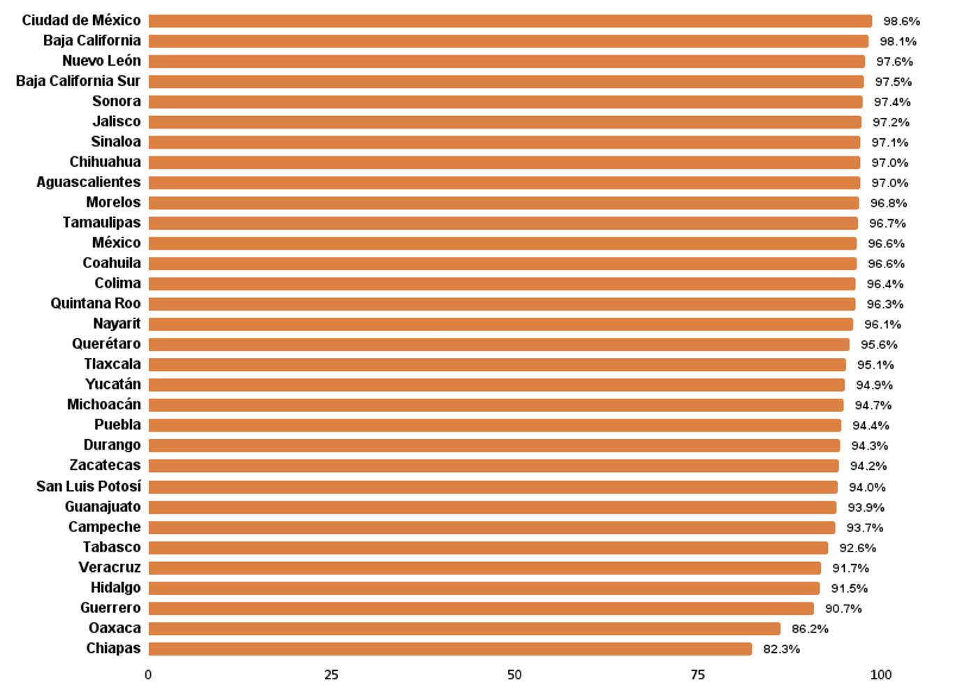 Si analizamos estos mismos datos, pero ahora considerando el tipo de tecnología con el que cuentan los hogares, se observa que el dispositivo más frecuente es el teléfono celular. En todos los estados de la República, por lo menos 8 de cada 10 casas cuentan con uno. Nuevamente, los estados de Chiapas, Oaxaca y Guerrero ocupan los últimos lugares, aunque los niveles que presentan son muy cercanos a los de la Ciudad de México, Baja California y Nuevo León, que son las entidades que mejores números tienen en cuanto a presencia de telefonía celular. Cabe destacar que, de acuerdo con un reporte sobre la cobertura móvil elaborado por el Instituto Federal de Telecomunicaciones, el 83 % de los municipios en México tienen cobertura de estas tecnologías móviles, situación que facilita su uso en prácticamente cualquier región.