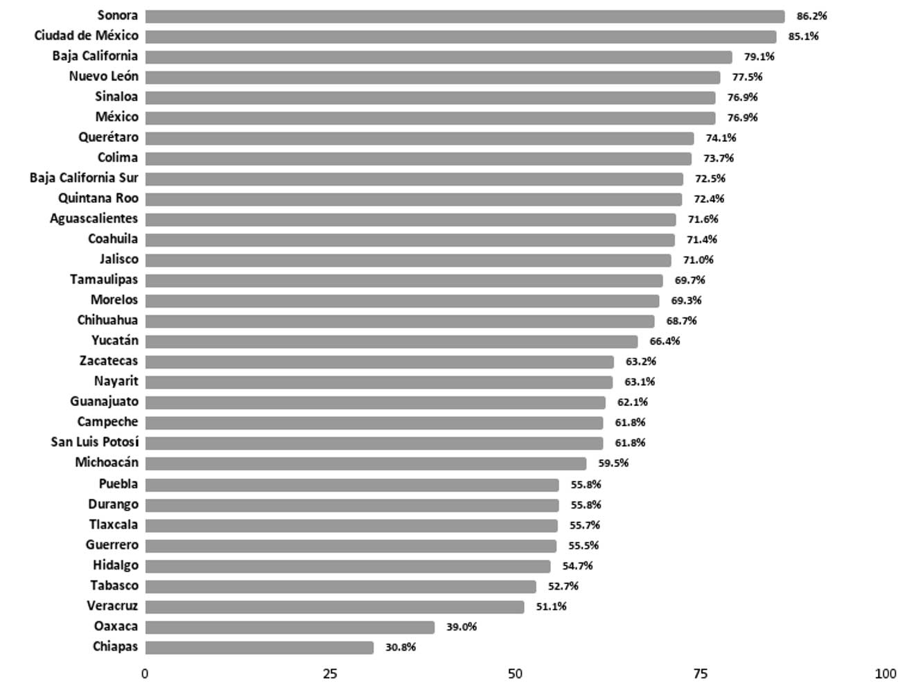 Precisamente, al examinar dicha variable, se encuentra la mayor desigualdad entre territorios. En Oaxaca y Chiapas sólo 3 de cada 10 hogares cuentan con conexión a la web, en tanto que lugares como Sonora y Ciudad de México tienen un acceso cercano al 90 %. En pocas palabras, por cada vivienda que tiene internet en Chiapas, existen tres en Sonora o Ciudad de México con esa condición. Además de esta tremenda diferencia, es importante hacer notar que existen diez estados que tienen a la mitad de sus viviendas sin acceso a internet.