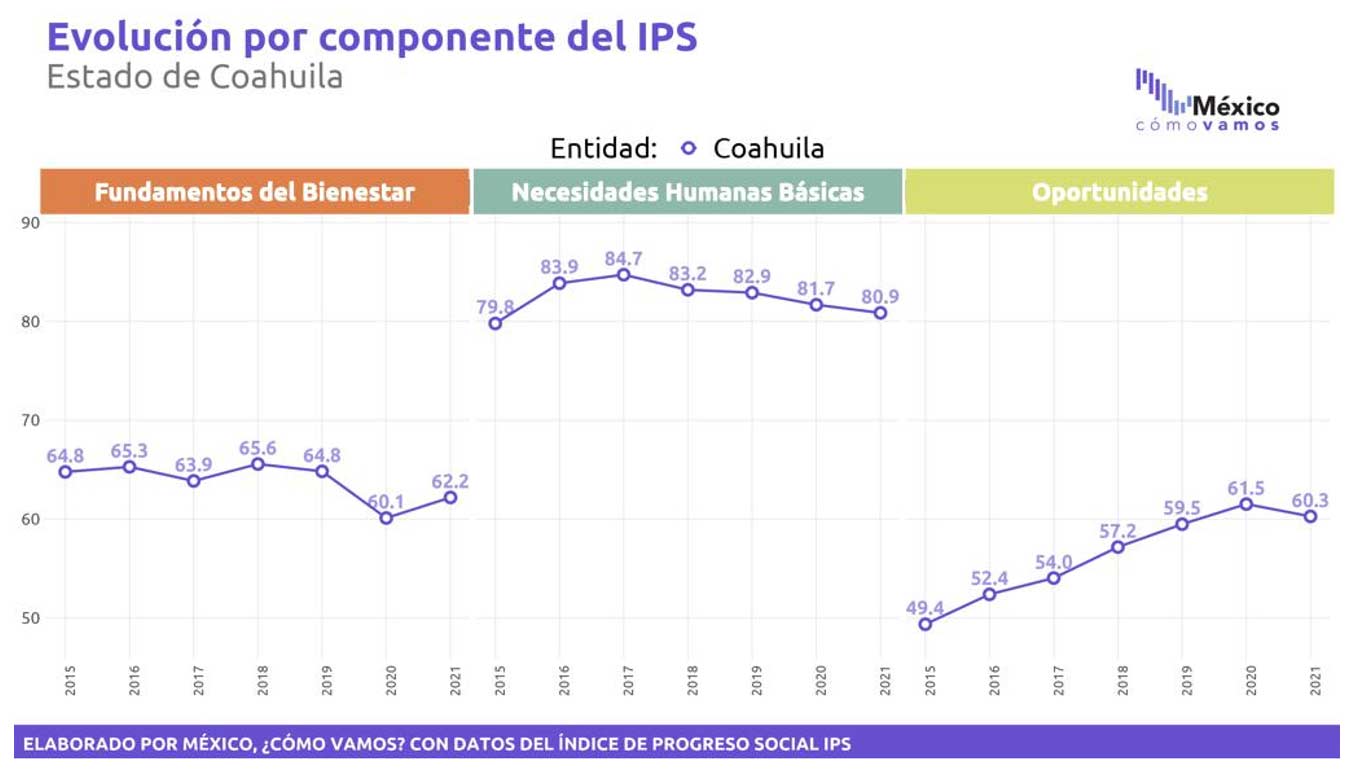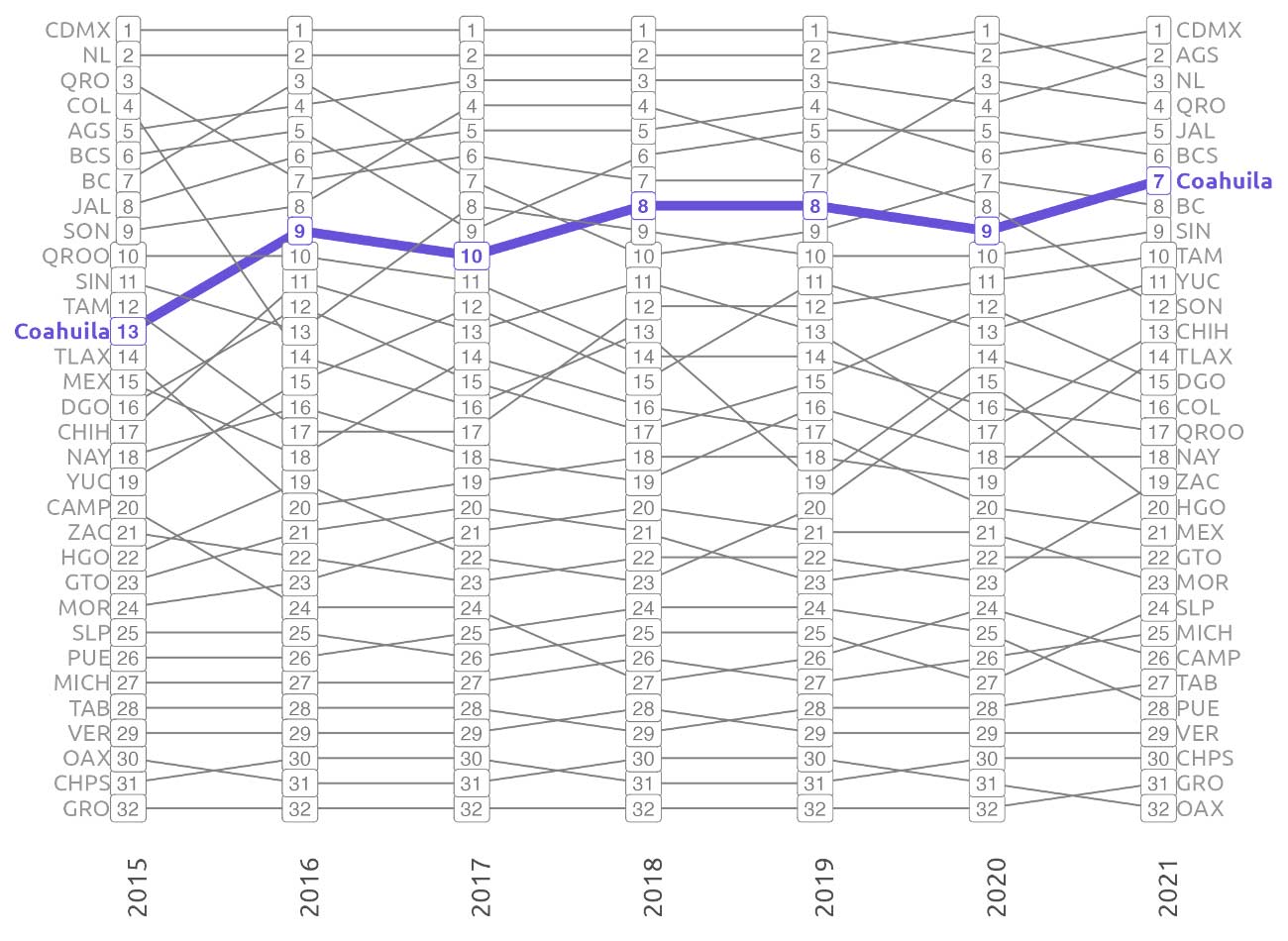 En esta medición, elaborada por México, ¿cómo vamos?, Coahuila se coloca en el séptimo lugar, por debajo de entidades como la Ciudad de México, Aguascalientes, Nuevo León, Querétaro, Jalisco y Baja California Sur. La entidad ha presentado una mejoría sostenida en los rankings estatales: pasó del treceavo lugar en 2015 al séptimo lugar en la edición 2021.