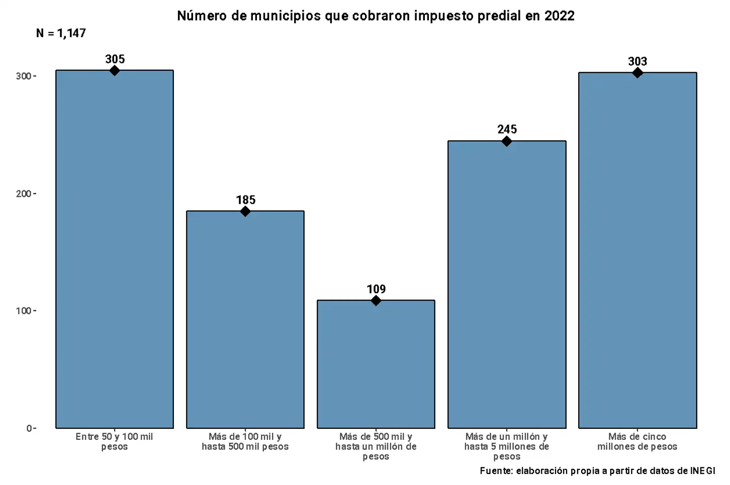 Lo mismo ocurre en materia fiscal: los retos que enfrentan los gobiernos municipales son variados. Como se muestra en la gráfica 2, en 2022 únicamente 1147 municipios tuvieron ingresos por concepto de la recaudación del impuesto predial. De ellos, casi una tercera parte recaudó una cantidad menor a 100 000 pesos, incluso, hay municipios que recaudaron únicamente 50 pesos. Naturalmente, las estrategias que busquen fortalecer las capacidades de recaudación municipal deben ser diferenciadas.