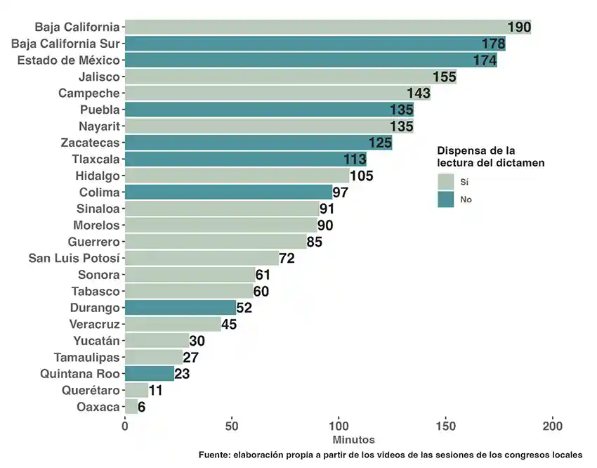Donde no hubo suspenso alguno fue sobre si se alcanzaría el tercer filtro necesario para las reformas constitucionales: la ratificación de al menos la mitad de las legislaturas estatales. Todo mundo daba por hecho que los congresos locales aprobarían las reformas con la misma disciplina que el Legislativo federal. La sorpresa, quizá, fue la celeridad, falta de debate y la capacidad de sumar votos opositores para, en cuestión de minutos, aprobar una reforma constitucional compleja. En las carreras por ser quien aprobara primero la reforma, el Congreso de Oaxaca tomó sólo seis minutos; lo hizo por unanimidad y sin discusión, con el voto incluso de diputados del PRI, PAN y PRD. El primer rechazo también fue exprés: Querétaro la rechazó en once minutos. Si contamos los minutos transcurridos desde que la mesa directiva presentó ante el pleno la minuta mandada por el Congreso de la Unión (en algunos casos dispensando la lectura del dictamen) hasta el término de su votación, encontramos, como se ve en la gráfica, que en siete estados las sesiones no duraron ni una hora y la más larga apenas rebasó las tres horas (la gráfica sólo muestra los estados que habían votado al 14 de septiembre).