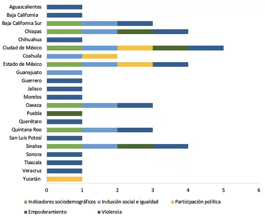 En la Gráfica 1 mostramos los rubros de información presentes en cada uno de los institutos revisados. Lo primero que salta a la vista es que sólo ocho de las 32 instituciones locales destinadas a impulsar la igualdad de género publicitan información desagregada por sexo sobre dos o más de los indicadores con perspectiva de género seleccionados, y sólo una —la Secretaría de las Mujeres de la Ciudad de México— tiene información de los cinco indicadores. En cambio, diez de ellas no difunden información diferenciada entre hombres y mujeres, y once de las catorce entidades sólo lo hacen sobre el indicador que refiere a la existencia de “alertas de género”.