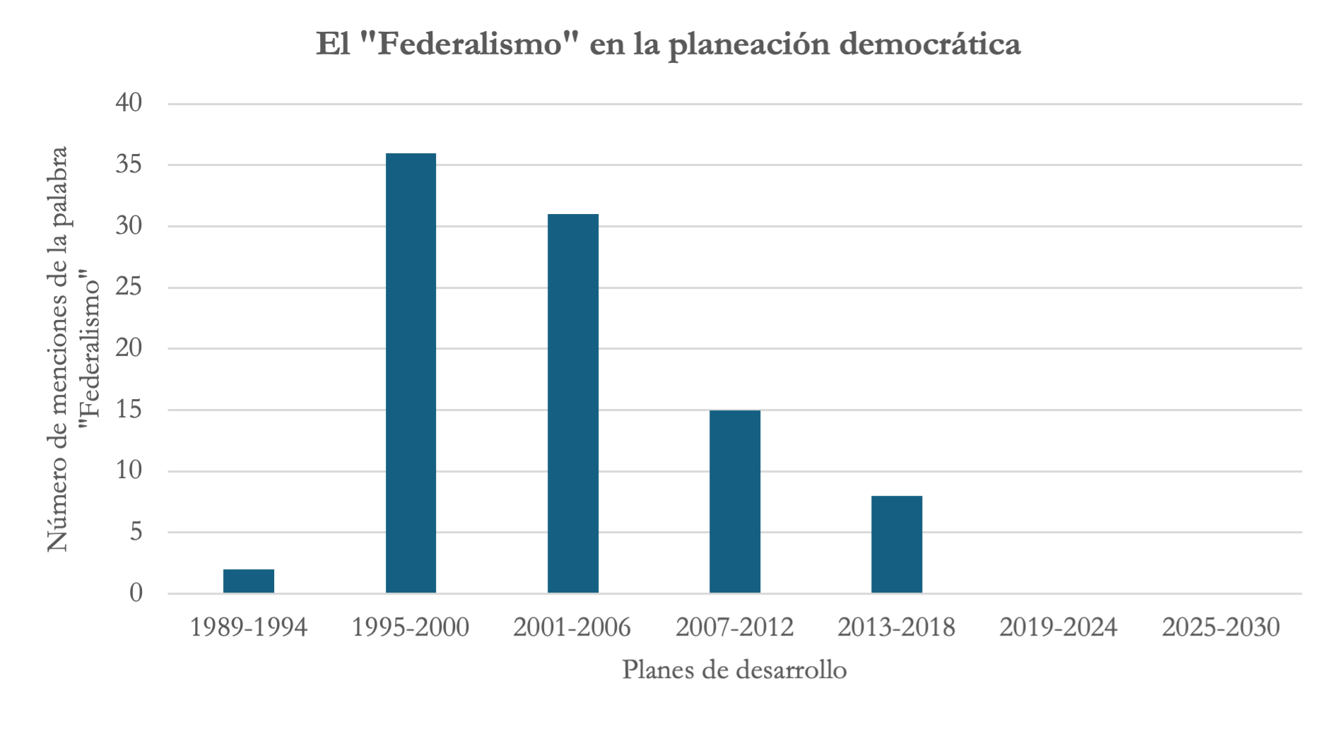 En México, como República federal, la planeación nacional ha reconocido la necesidad de la participación de gobiernos estatales y municipales en su implementación y la importancia de contar con un sistema federal funcional. En 1994, pese a que sólo dos gobernadores pertenecían a la oposición —Ernesto Ruffo en Baja California y Francisco Barrios en Chihuahua—, se creó el “Programa para un nuevo federalismo”. Posteriormente, en 2001, durante el primer gobierno de la transición, se publicó el “Programa especial para el auténtico federalismo”, enfocado en coordinar y evaluar políticas de descentralización y desarrollo municipal. En 2007, el Plan Nacional de Desarrollo de Felipe Calderón mantuvo el federalismo como un objetivo sectorial clave, señalando que era “una herramienta invaluable para potenciar el desarrollo del país y fortalecer la gobernabilidad democrática”. Durante el gobierno de Enrique Peña Nieto, aunque con menor énfasis, se mencionó la necesidad de “impulsar un federalismo articulado” como parte de los esfuerzos para fortalecer el Estado y garantizar la paz. En cambio, en el sexenio de López Obrador y Plan Nacional de Desarrollo propuesto por la presidenta Claudia Sheinbaum, la palabra “federalismo” no aparece ni una vez.