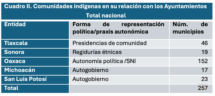 Además, al considerar a las comunidades indígenas con derechos concretos reconocidos en legislaciones estatales y que aquellas se encuentran dentro de demarcaciones municipales, hay al menos otros 257 municipios que tienen en sus ámbitos y ejercicios de gobierno instalado el pluralismo jurídico como se puede apreciar en el cuadro II.