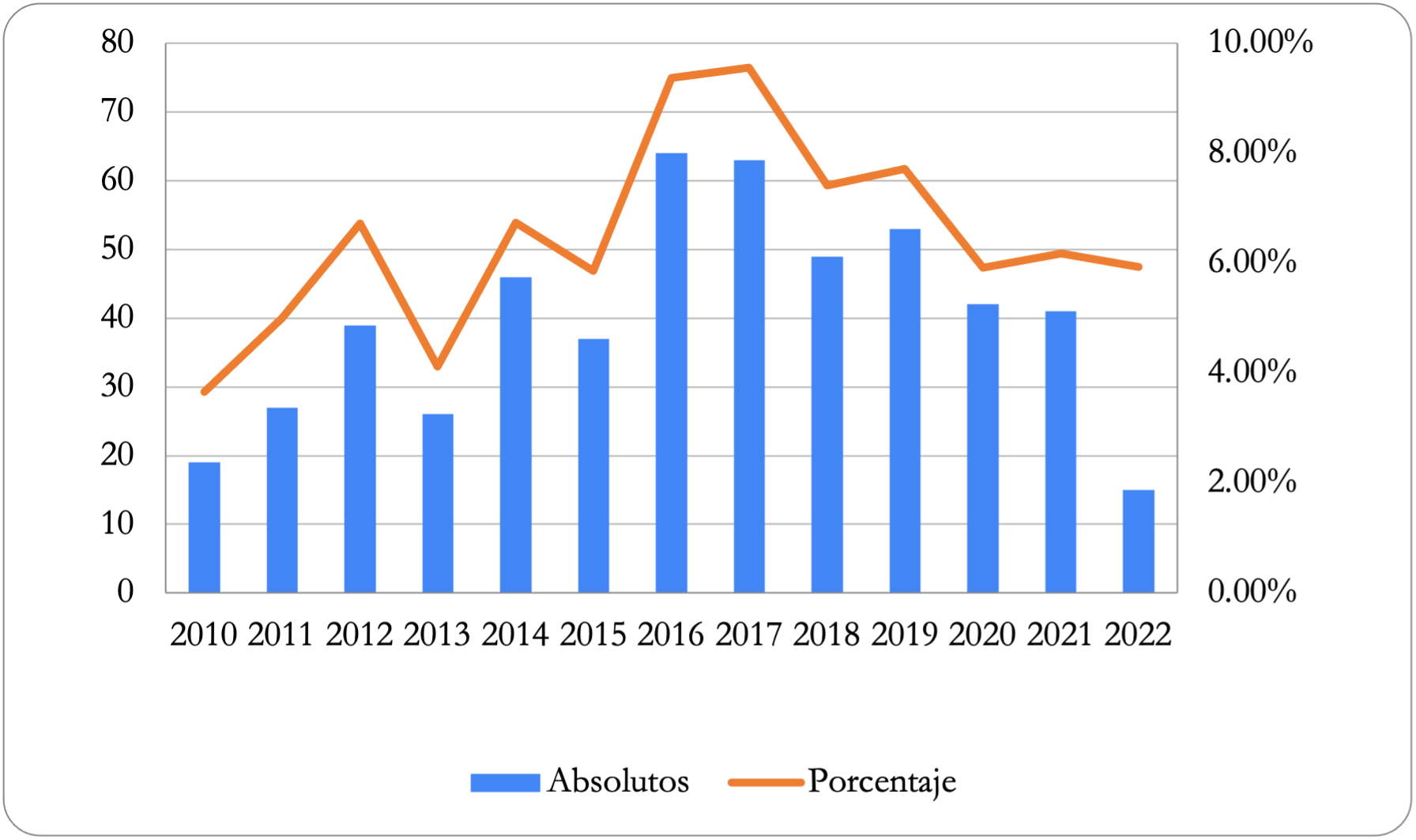 Gráfica 1. Presencia de artículos sobre política subnacional en las revistas analizadas (números absolutos y % por año, 2010-2022)