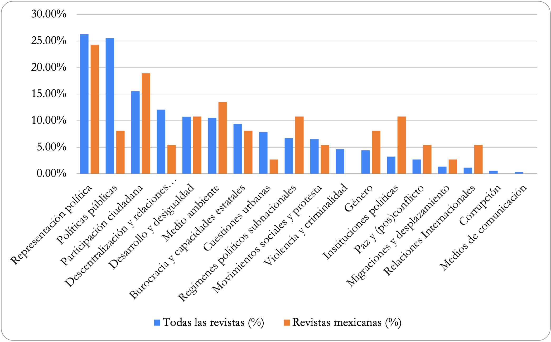 Los temas estudiados también varían notablemente (Gráfica 2). Sin embargo, los dos temas predominantes son representación política (elecciones, sistemas de partidos o clientelismo) y políticas públicas (diseño, implementación y evaluación de políticas públicas), ambas con algo más de un 25 % de artículos, seguidos por participación ciudadana y descentralización y relaciones intergubernamentales.
