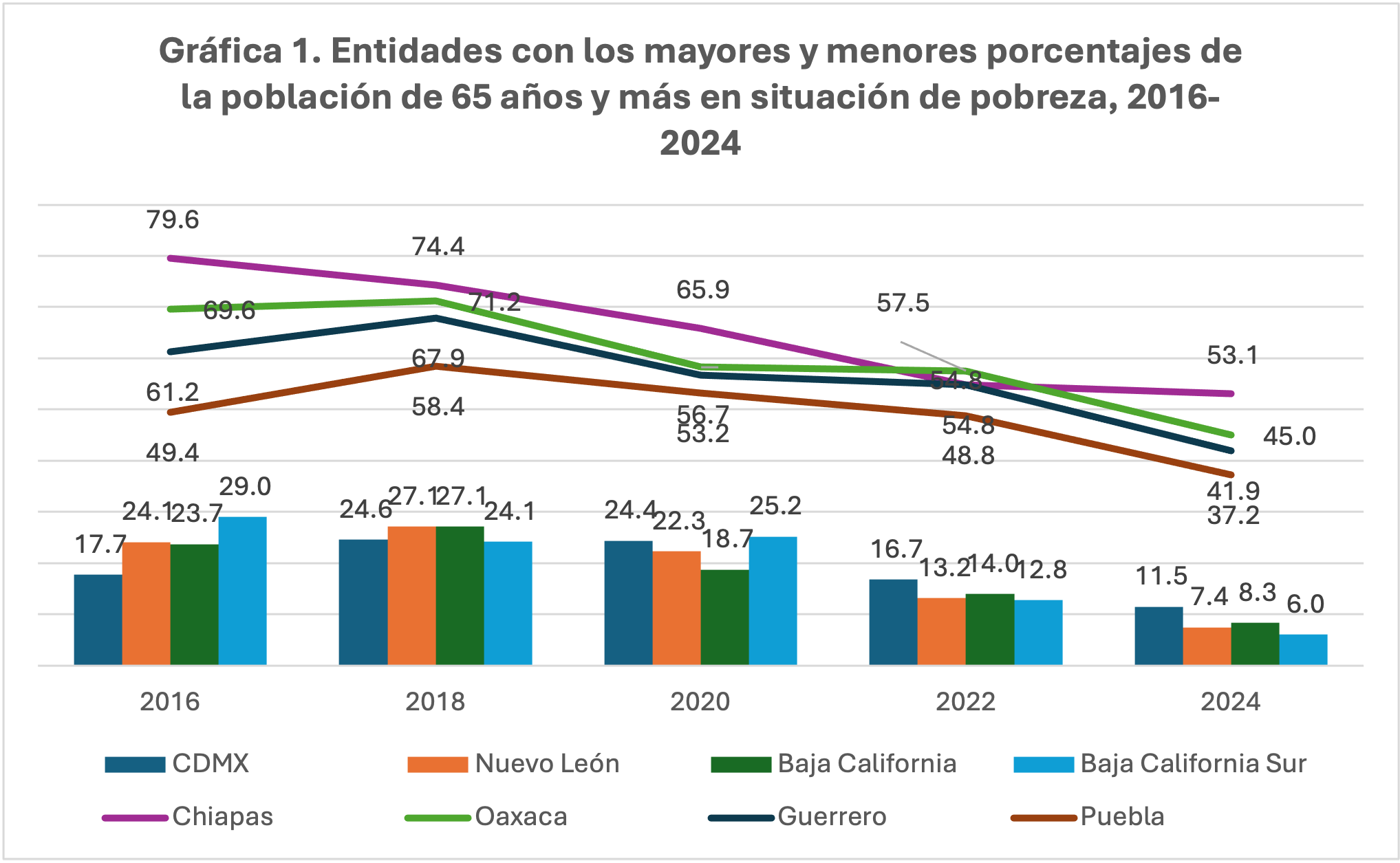 Estos rezagos no sólo reflejan desigualdades por edad, sino también la forma en que el arreglo federal mexicano condiciona la provisión de derechos, dada la dependencia de estados y municipios en materia de salud y educación. En un contexto federal, estas carencias se ven agravadas por las capacidades diferenciadas de los gobiernos subnacionales, responsables de garantizar buena parte de estos servicios. Como se aprecia en la gráfica 1, en 2016 Chiapas tenía casi ocho de cada diez personas de 65 años y más en situación de pobreza (79.6 %), y aunque para 2024 esta proporción se redujo a 53.1%, sigue siendo el estado con mayor rezago. Oaxaca y Guerrero presentan trayectorias similares, al pasar de 69.6 % y 61.2 % a 45.0 % y 41.9 %, respectivamente. Puebla, en cambio, registró un repunte en 2018 que lo llevó a 67.9 %, pero cerró en 37.2 %.