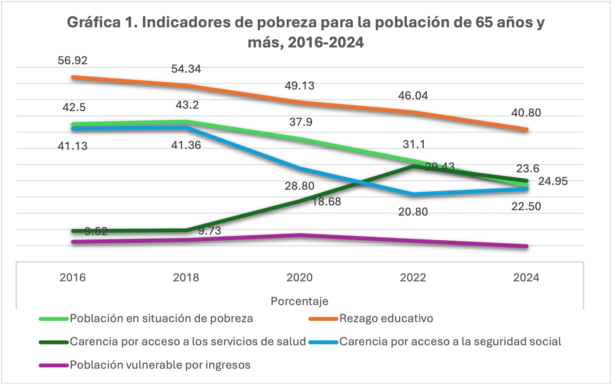 Las carencias sociales ofrecen un panorama mixto. El acceso a la seguridad social mejoró de manera notable, pasó de 41.1 % en 2016 a 22.5 % en 2024, gracias a las transferencias públicas. En contraste, la falta de acceso a servicios de salud aumentó hasta 34% en 2022, aunque después retrocedió a 25 % en 2024. Además, el rezago educativo sigue siendo alto, pues afecta a 40 % de los adultos mayores. Por una parte, los adultos mayores han mejorado sus condiciones de vida, pero el acceso a la salud y la educación continúan siendo sus principales desafíos.