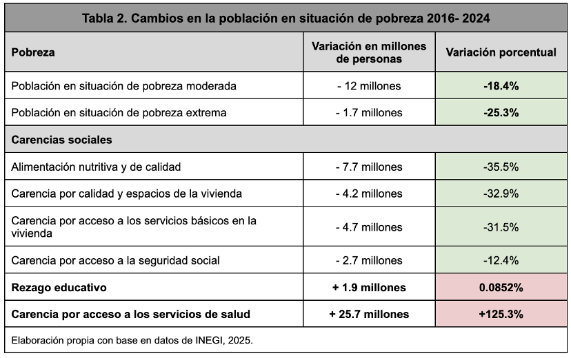 Con base en este modelo, los datos muestran que, en términos generales, en México la pobreza multidimensional está disminuyendo. Hay menos personas en situación de pobreza moderada y pobreza extrema, y la mayor parte de las carencias sociales han disminuido, con excepción de dos: la carencia por acceso a los servicios de salud y el rezago educativo (véase Tabla 2).