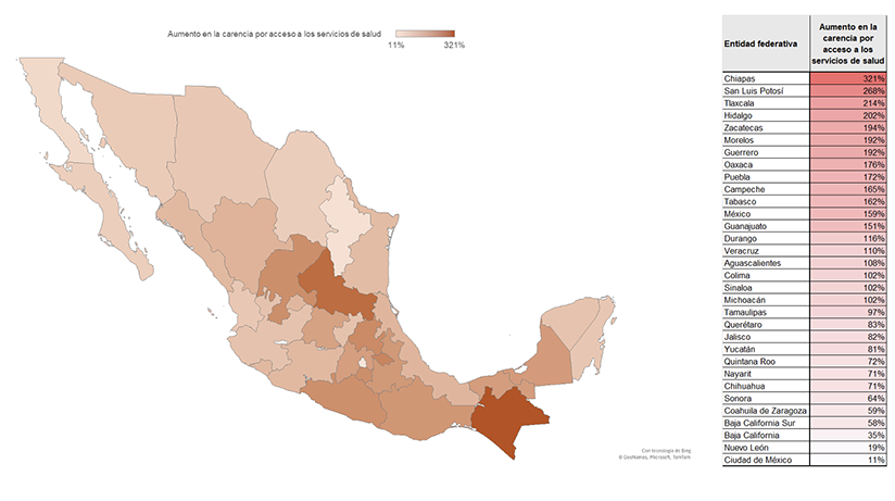 Las diferencias son contrastantes en todo el territorio y no hay necesariamente una lógica geográfica, lo que implica que la carencia aumentó de forma muy desigual. Por ejemplo, en general los estados del norte del país son los que menor incremento han tenido. Esto es notable al señalar los estados con mayor incremento: Chiapas (del sur) y San Luis Potosí (del centro). ¿Por qué existe tanta diferencia entre estados? No se pretende concluir el debate en este texto, pero sí ponemos sobre la mesa la posible relación que puede existir entre las fallas de la estrategia de salud a nivel federal y las diversas capacidades institucionales con las que cada entidad cuenta en materia de salud, para determinar el retroceso tan particular en cada estado. Esto es lo que nos inquieta: diferencias tan abismales son un síntoma agudo de que esta grieta se profundiza al no tener un sistema federal de salud consolidado.