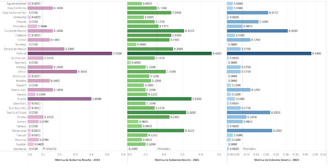 En 2019, el valor promedio del componente de datos abiertos fue de 0.10, con ocho estados sin datos disponibles. Para 2021, el promedio ascendió a 0.16 y sólo una entidad federativa quedó fuera del registro. Sin embargo, en 2023, el promedio cayó nuevamente a 0.08 y cinco estados no alcanzaron el umbral mínimo de publicación, lo que evidencia la fragilidad de los avances a nivel local. Aunque el gobierno federal ha mantenido una posición destacada en las tres mediciones, únicamente algunas entidades —como Ciudad de México, Estado de México, Jalisco, Puebla, San Luis Potosí y Tamaulipas— han logrado niveles altos de cumplimiento (ver Figura 1).