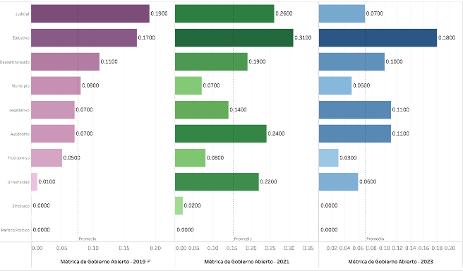 Las limitaciones institucionales señaladas en la trayectoria normativa encuentran un reflejo directo en los resultados empíricos. Las mediciones de la Métrica de Gobierno Abierto (MGA) (2019, 2021 y 2023), permiten dimensionar con mayor precisión la distancia entre el diseño formal y la implementación práctica, tanto a nivel estatal como por tipo de sujeto obligado.