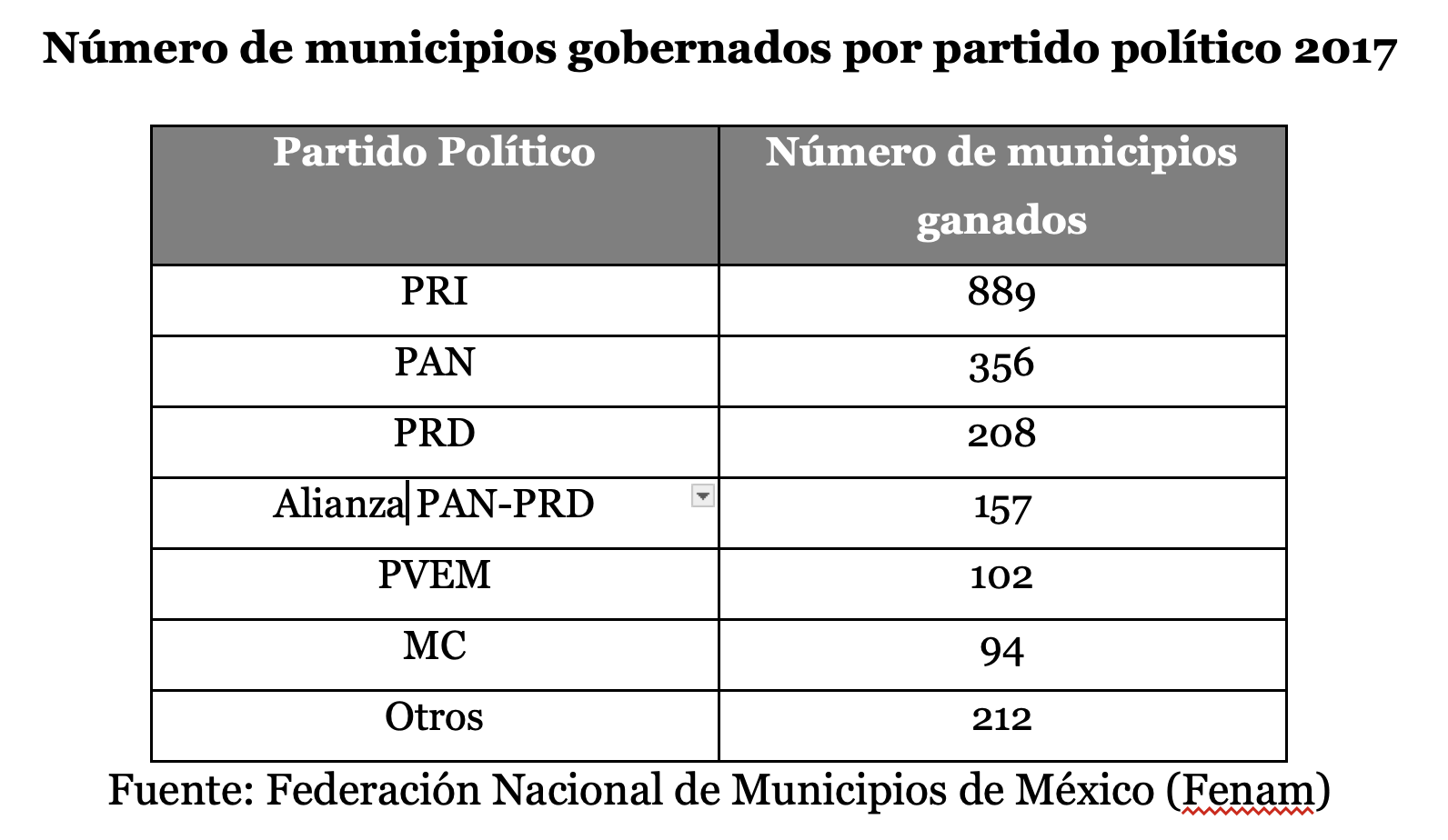 Cinco años después, en 2017, un año previo a la elección presidencial el PRI gobernaba 889 municipios del país, es decir el 43.1 % de los municipios electos por partidos políticos, el PAN gobernaba 356 municipios que representaban el 17.2 % seguido por el PRD con 208 municipios con el 10 %, el PAN y PRD en alianza con 157 equivalente al 7.6 %, PVEM con 102 municipios que representaban el 4.9 %, Movimiento Ciudadano con 4.5 % y otros incluido el naciente partido de Movimiento de Regeneración Nacional (Morena) con 208 equivalente a 10.1 % del total de municipios. El partido que por más de setenta años había permanecido en el poder y había regresado mantenía la mayoría de los municipios de México a pesar de dos alternancias.