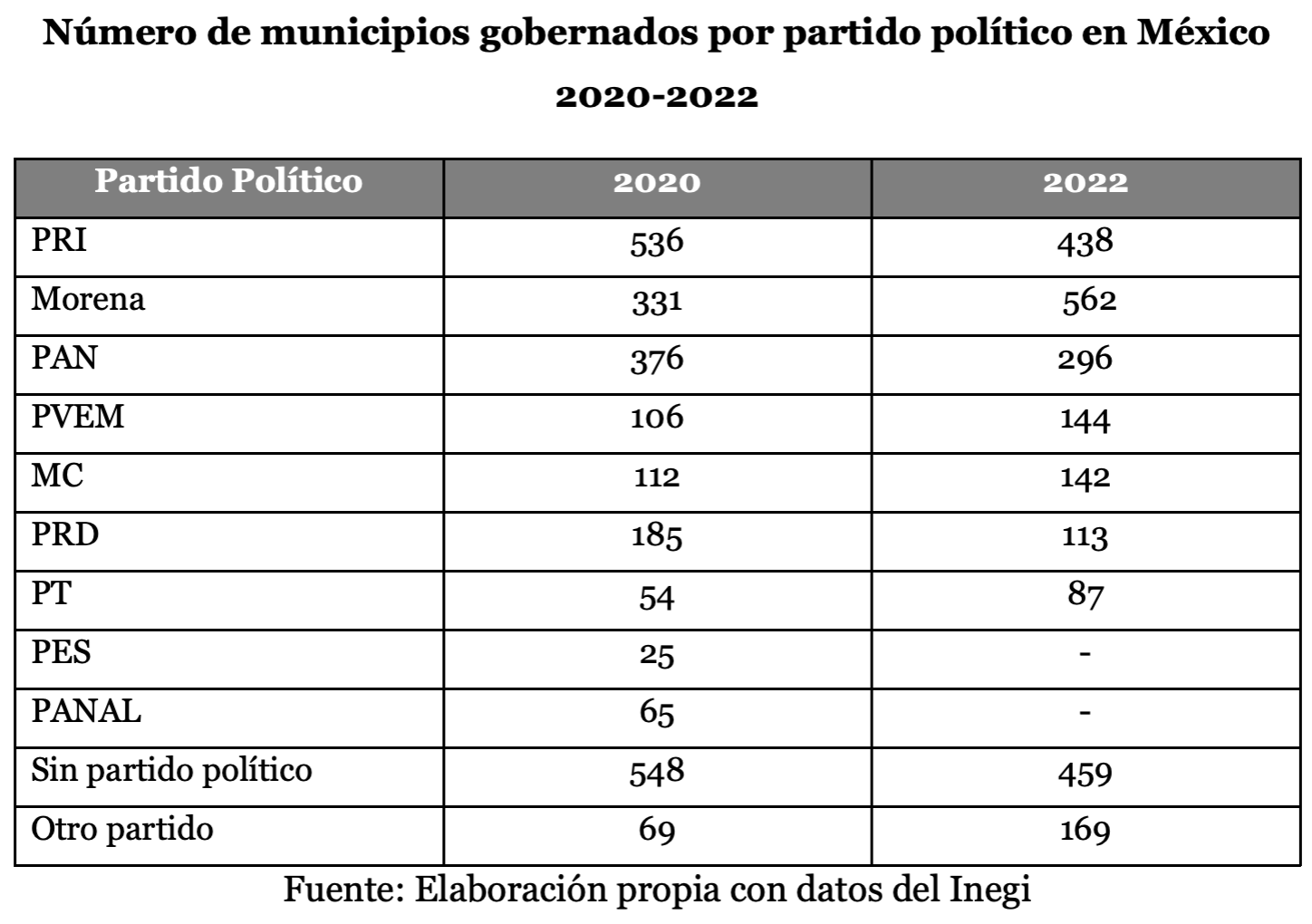 Tras las elecciones de 2021 esta configuración cambió y para el año 2022, Morena ya gobernaba 562 (28 %), seguido del PRI con 438 (21 %) y desplazando al PAN hasta tercer lugar con 296 (14 %) del total de municipios del país. Por primera vez en 2022 un partido diferente al PRI gobernaba la mayoría de los municipios de México, lo que evidenciaba que, a nivel agregado en los gobiernos municipales, la alternancia en términos de una mayoría de municipios gobernados por un partido político había llegado más de 90 años después a pesar de las reformas que se habían propuesto para garantizar una mayor representatividad.