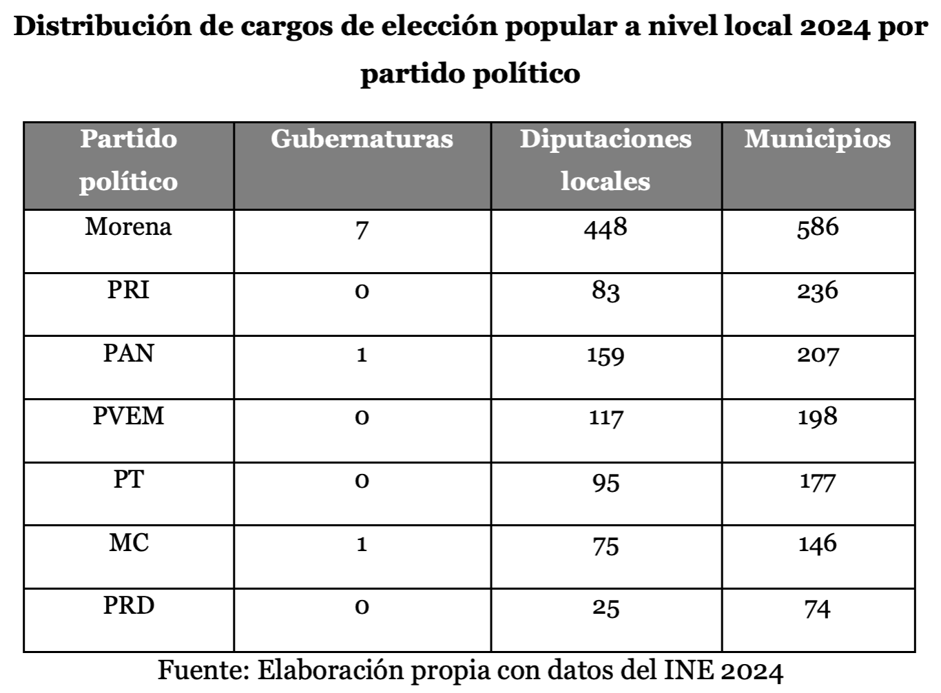 Los resultados de las elecciones a nivel nacional de 2024 que dieron como ganadora a Claudia Sheinbaum Pardo de la alianza encabezada por Morena quien obtuvo 35 millones 924 mil 519 votos. Sheinbaum ganó en casi todas las entidades del país (salvo Aguascalientes) y en la mayoría de los niveles económicos y educativos del electorado. A nivel subnacional o local, la coalición encabezada por Morena ganó las gubernaturas en siete de las nueve entidades en disputa, acumulando 23 gobernadores y la jefatura de Gobierno de la CDMX (24) y 961 municipios seguido del PRI con 236 y del PAN con 286, lo que significa que en 2025 Morena y sus aliados gobernaban en 2025 al 77.2 % de la población a nivel estatal.