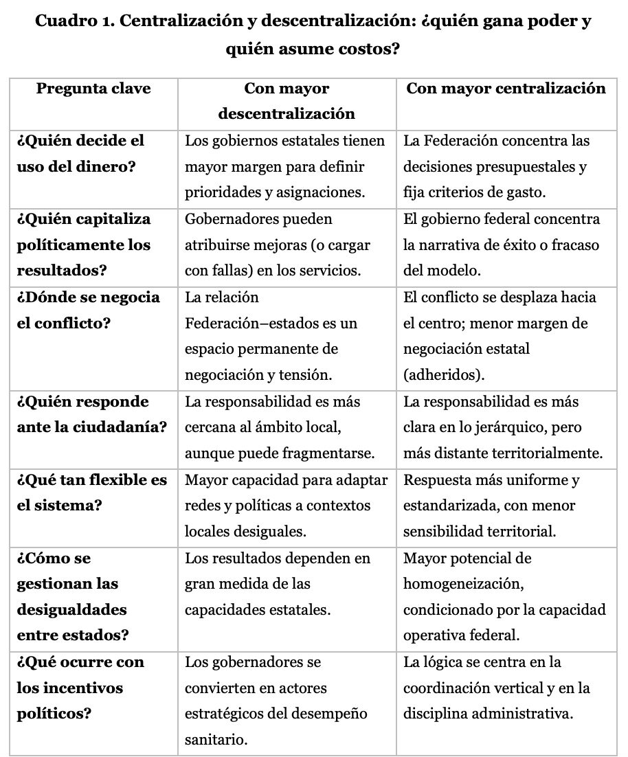 La experiencia mexicana confirma que el debate no puede plantearse en términos binarios. Cada arreglo redistribuye capacidades, riesgos y responsabilidades entre la Federación y los estados, generando compensaciones entre coordinación nacional, autonomía territorial y rendición de cuentas (Cuadro 1).