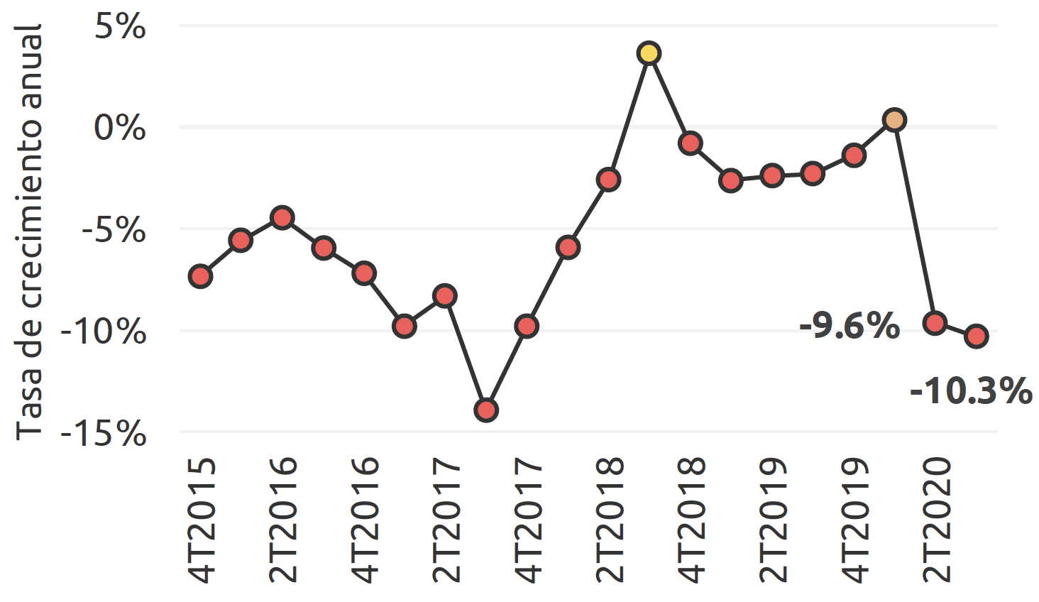 En los primeros 3 trimestres de 2020, la economía de Campeche se contrajo (-)6.5 % anual, en promedio. Previo a esto, su economía se había contraído a una tasa promedio de (-)5.4 % anual entre 2016 y 2019.