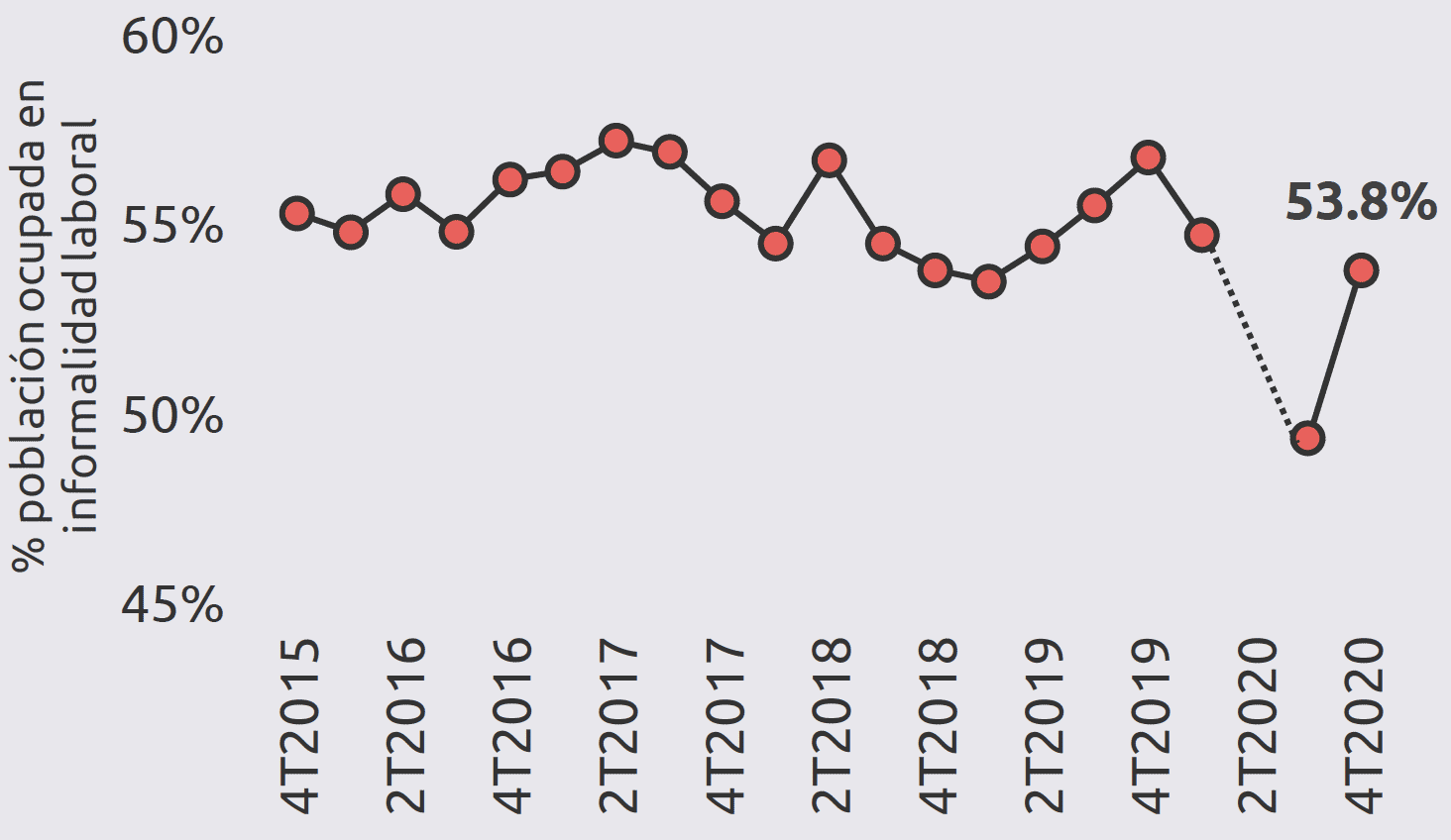 Campeche tiene la 12.ª tasa más alta de informalidad nacional, ya que 53.8 % de los trabajadores del estado tienen un empleo sin prestaciones laborales o vínculo reconocido. La tasa nacional fue de 51.1 % en el 4T2020.