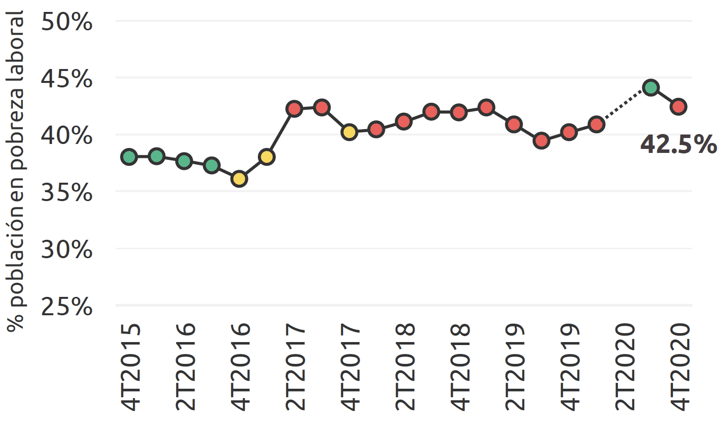 Con 42.5 % de su población en pobreza laboral (con ingresos laborales del hogar insuficientes para cubrir necesidades alimentarias mínimas), Campeche es el 13.º estado con peor desempeño en México, y su nivel aumentó 2.3 puntos respecto al 4T2019.