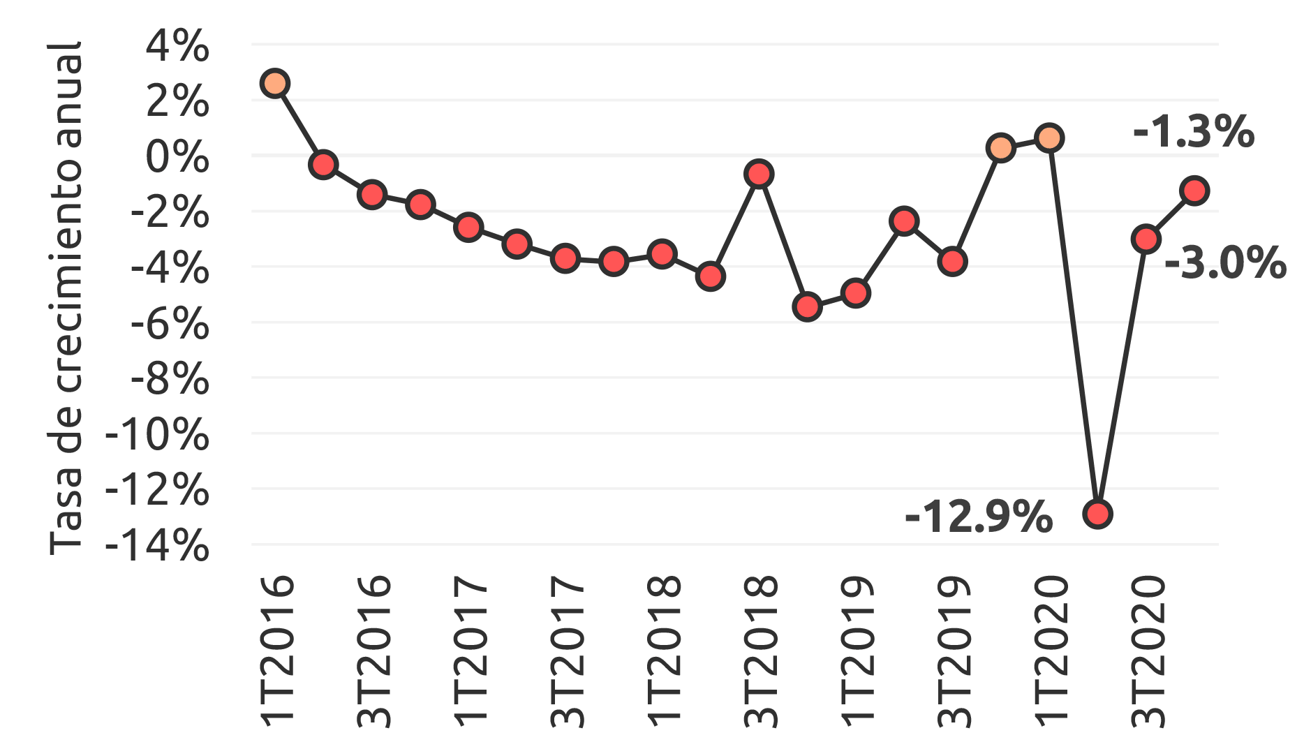 Durante 2020, la economía de Chiapas se contrajo (-)4.2 % anual, con una caída pronunciada en el 2T2020. Previo a esto, su economía se había contraído a una tasa promedio de (-)2.5 % anual entre 2016 y 2019.
