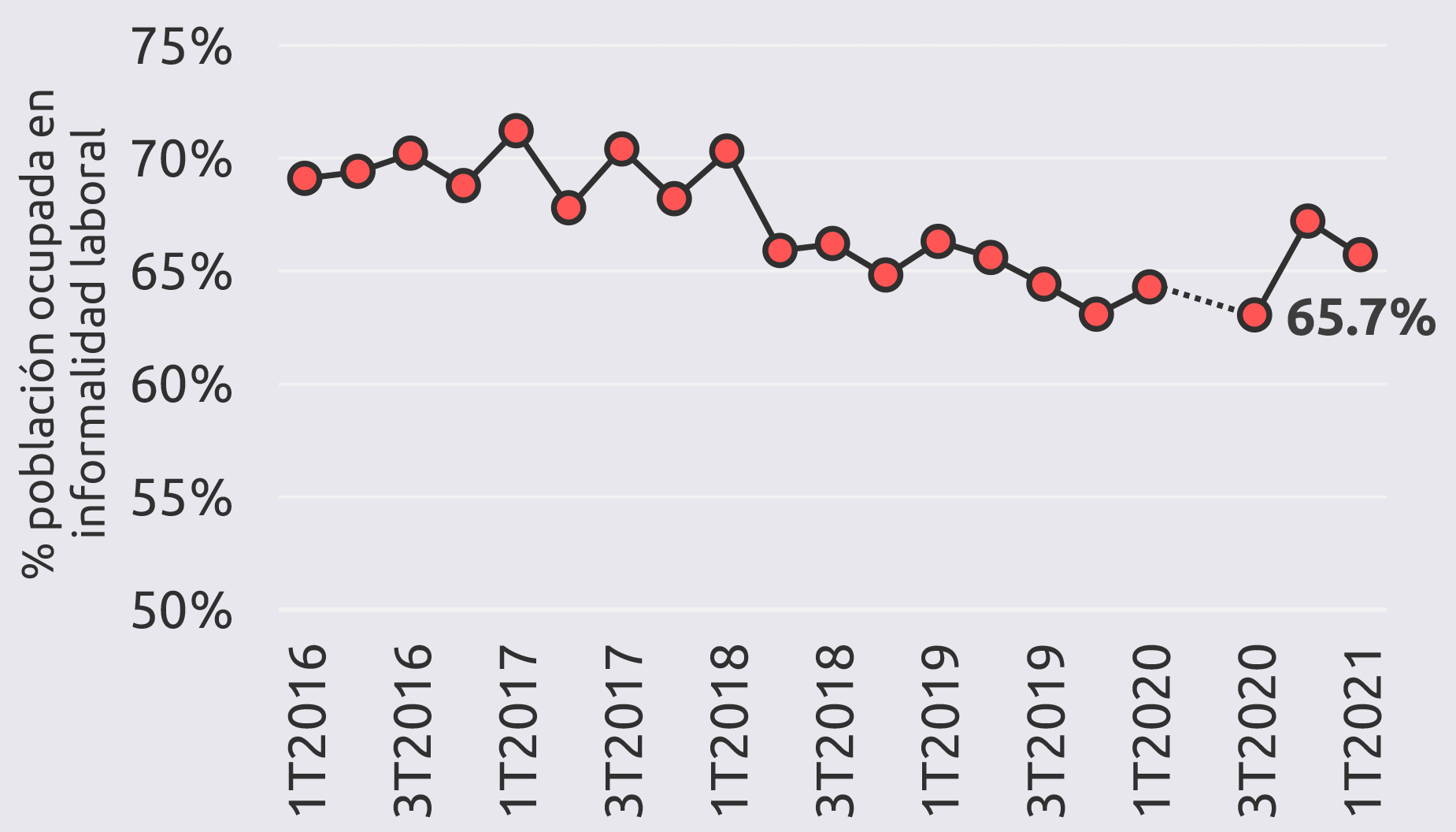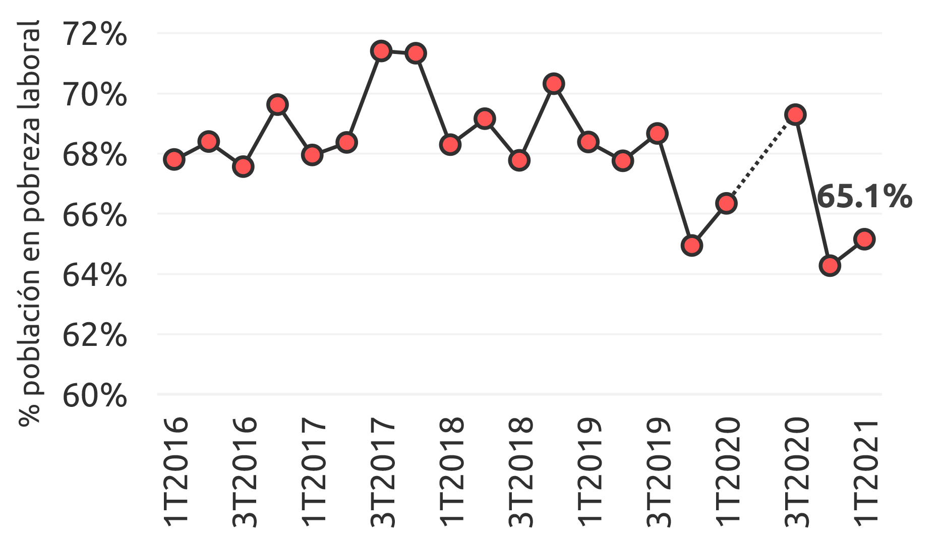 Con 65.1 % de su población en pobreza laboral (con ingresos laborales del hogar insuficientes para cubrir necesidades alimentarias mínimas), Chiapas es el estado con peor desempeño en México, aunque su nivel disminuyó 1.6 puntos respecto al 1T2020.