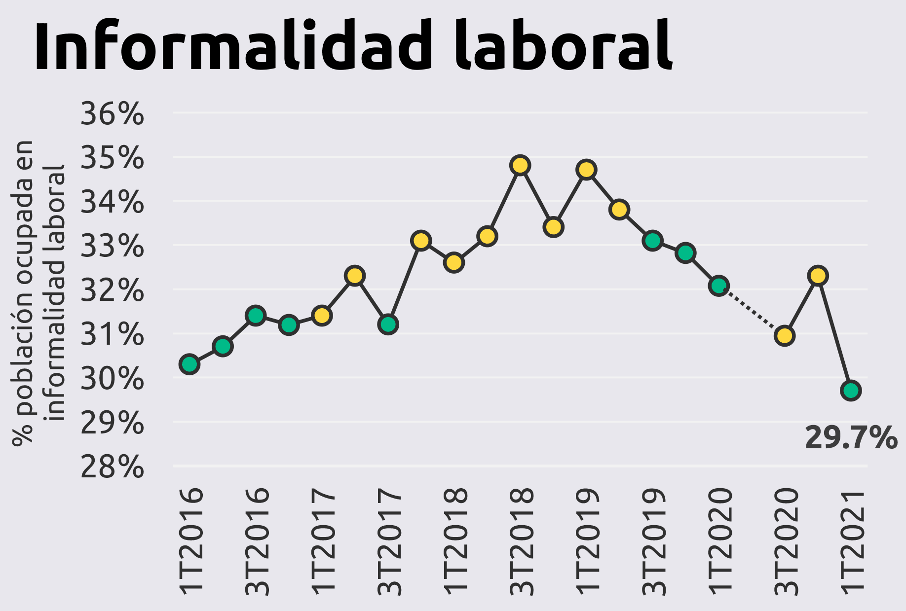 Chihuahua tiene la 1.ª tasa más baja de informalidad nacional, ya que 29.7% de los trabajadores del estado tienen un empleo sin prestaciones laborales o vínculo reconocido. La tasa nacional fue de 50.8 % en el 1T2021.