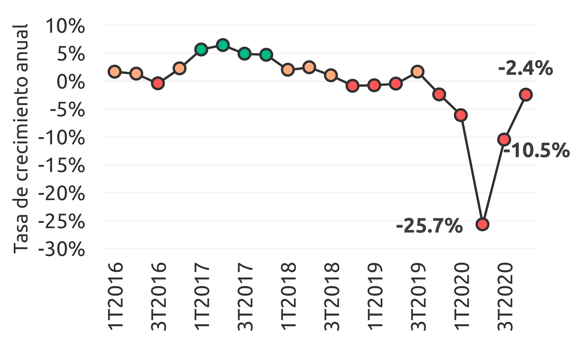 Durante 2020, la economía de Coahuila se contrajo (-)11.2 % anual, con una caída pronunciada en el 2T2020. Previo a esto, su economía había crecido a una tasa promedio de 1.8 % anual entre 2016 y 2019.