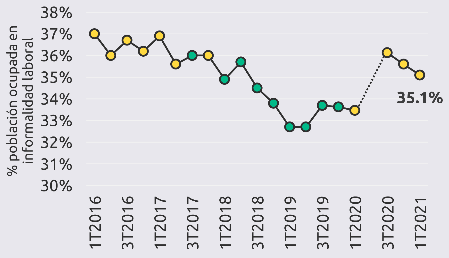 Coahuila tiene la 4.ª tasa más baja de informalidad nacional, ya que 35.1 % de los trabajadores del estado tienen un empleo sin prestaciones laborales o vínculo reconocido. La tasa nacional fue de 50.8 % en el 1T2021.